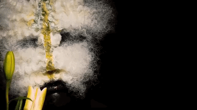In this next vignette from “Eating the Flowers” (2019), Azoulay, in a white mask, takes a bite out of a Calla lily. The catch is that flower is immensely poisonous. Look closely: It immediately causes an intense burning sensation in her mouth. The pain is briefly visible through the mask in her cheeks and lips. How ironic that a flower once associated with holiness is actually life-threatening when consumed. Isn’t it equally toxic that religious dogma often justifies hate, bigotry, misogyny, homophobia, and other prejudices?