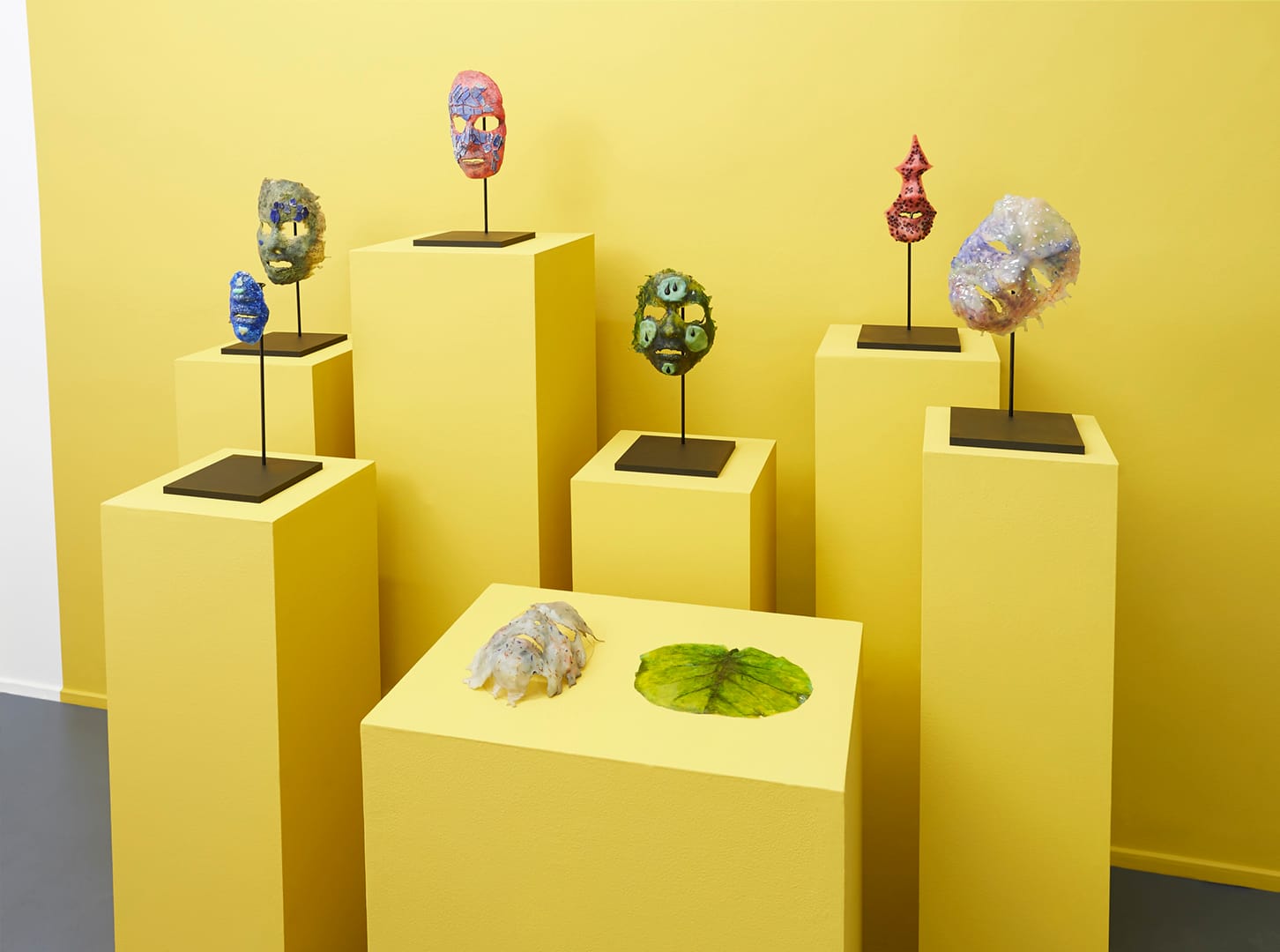 Azoulay’s visual puns play with the power of flowers and stones. Drawing inspiration from Victorian sources as well as medieval discoveries, she invites us to experience their symbolic potency with captivating visuals. The masks can also be viewed in person at the exhibition. What sounds like faint bells plays in the background, heightening the sense of awe and mystery. It is actually the sound of the bronze mask from “Nocturne” (2018) being struck. Bruce Nauman once wrote in neon that “the true artist helps the world by revealing mystic truths.” He forgot to write that it’s hard as hell. Few video artists today can pull off the aesthetic of the mystic as well as Karen Azoulay.