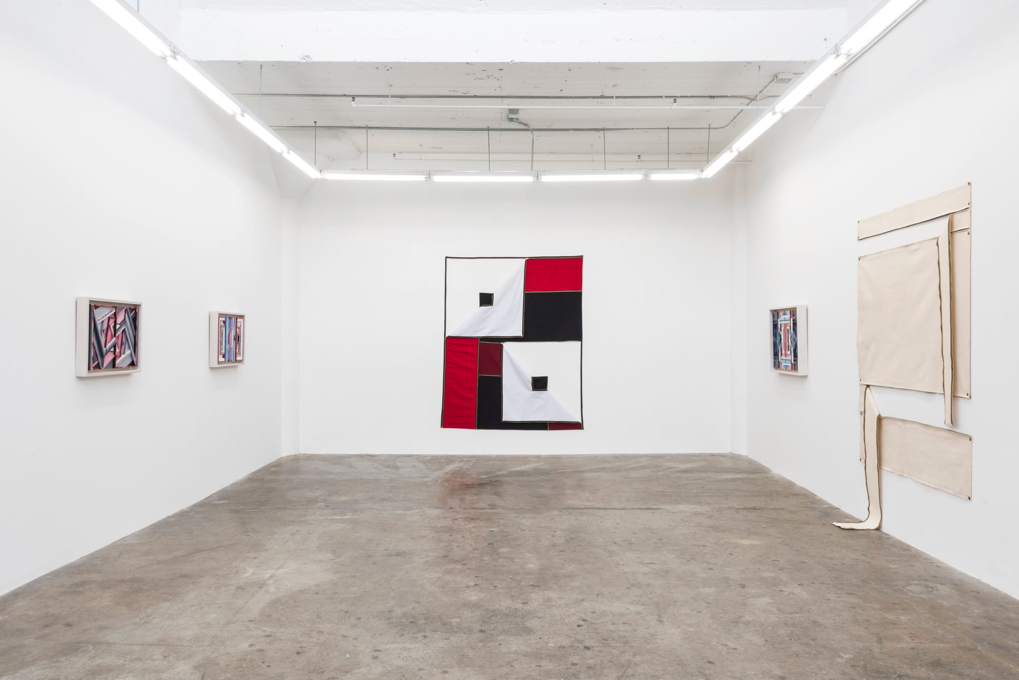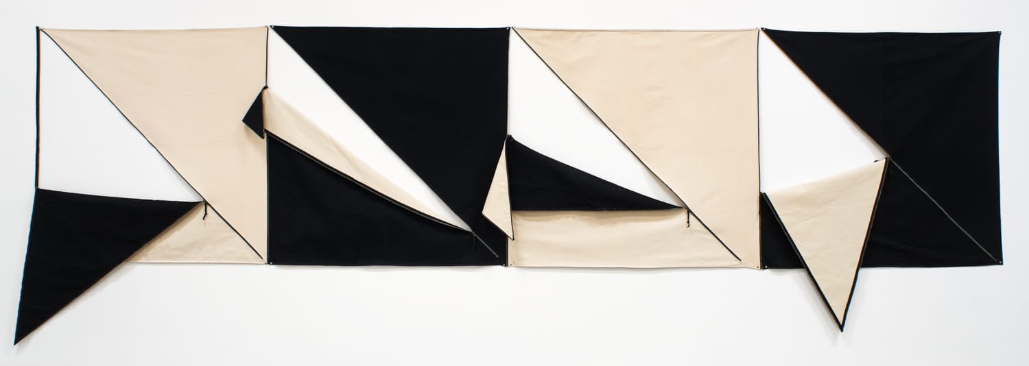 Along with the new pieces, some of Carson’s unstretched canvases and zipper pieces from the ’70s punctuate the gallery. These early works were meant to contrast with the male-dominated Hard-edge painting style that emerged in the 1950s and ’60s. Carson embraces Hard-edge’s geometric simplicity, but also rejects it by encouraging people to pull the zippers and rearrange the shapes in any way they desire. In GAVLAK, the canvases are in different stages of being unzipped to show the pieces’ range. Some are drawn far enough that a section of canvas drapes against the concrete floor, others are zipped halfway, creating beige right angles that subtly differentiate from the white walls that become absorbed into the composition.