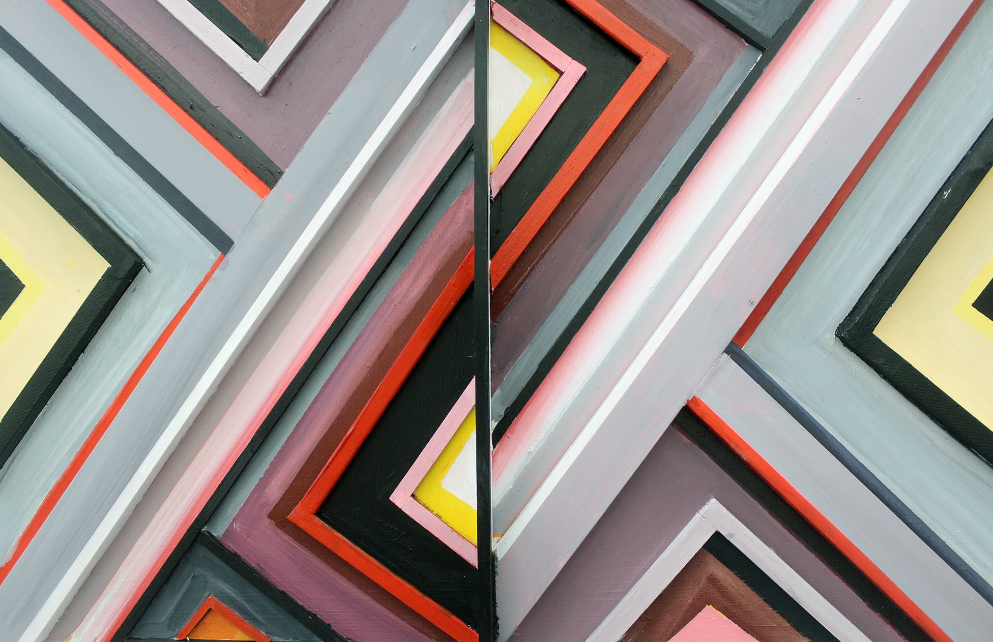 The geometric paintings pop off their three-dimensional surfaces, forming the edges of deep caverns that pull the viewer’s gaze into their core, but their symmetrical composition blooms into wide eyes that stare back while you stare in.
