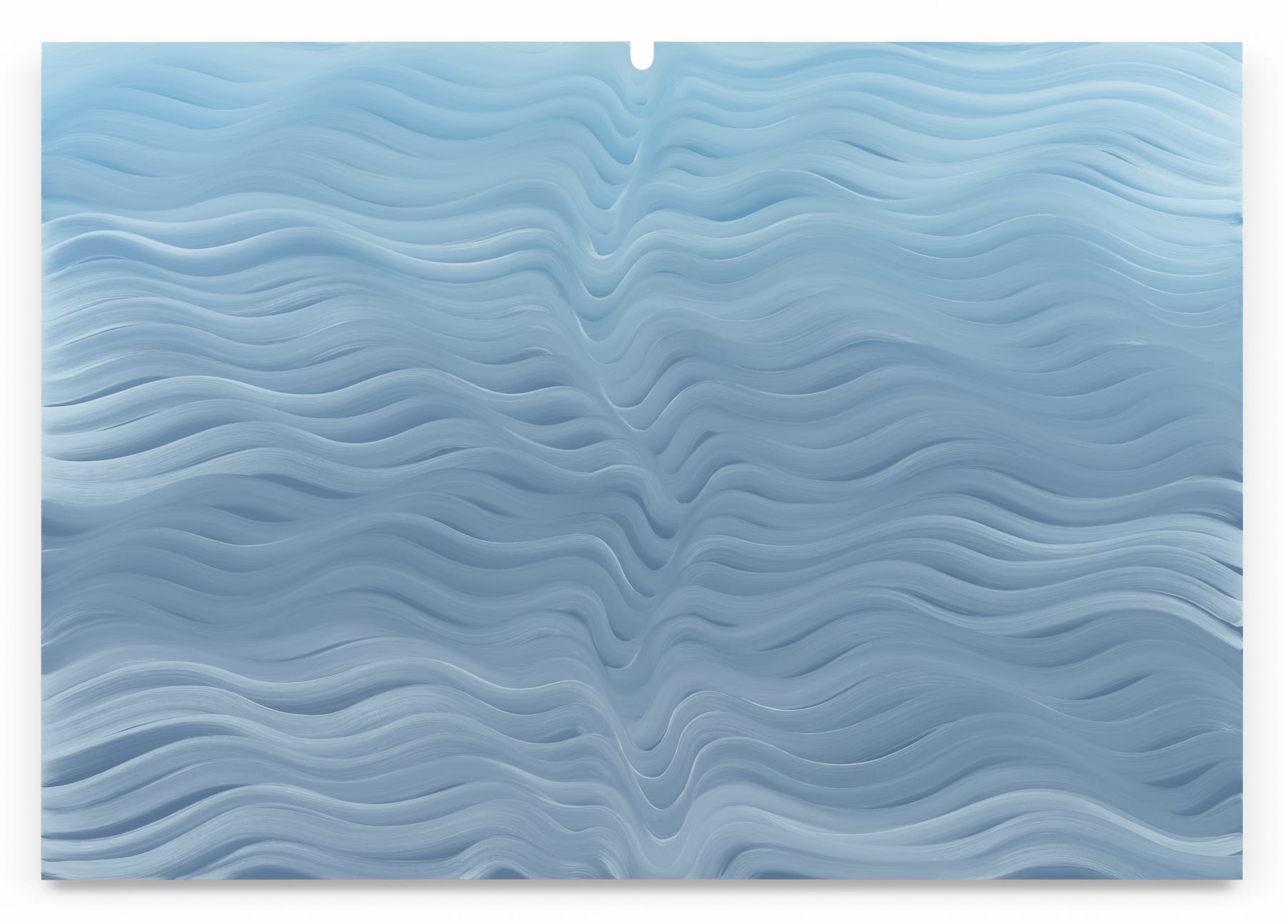 All of these qualities are featured in her aptly named exhibition It Comes In Waves at Miles McEnery Gallery. The show consists of eight tonally monochromatic paintings, six of them on a shaped canvas (all 2025). Each piece is composed of horizontal strokes that span the width of the canvas, resulting in an overall image of sensuously wavy ribbons.