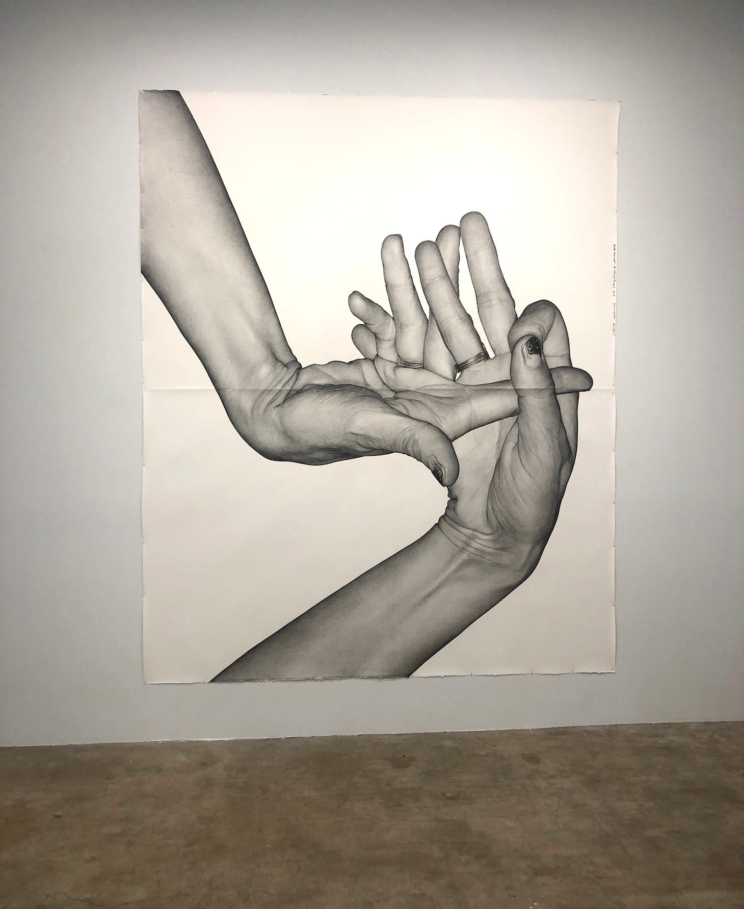 LOS ANGELES — At first glance, Double Dominant, a solo exhibition of new work by Karl Haendel at Vielmetter Los Angeles, appears technically masterful if somewhat predictable. The large-scale drawings of artists’ hands (in Haendel’s words a “portrait of an artist, by another artist, as an uncanny personified appendage”) seem like foreseeable choices for slightly alternative versions of classic portraiture. Upon closer inspection, however, the portraits become stranger through a series of subtle decisions you could miss in the blink of an eye.