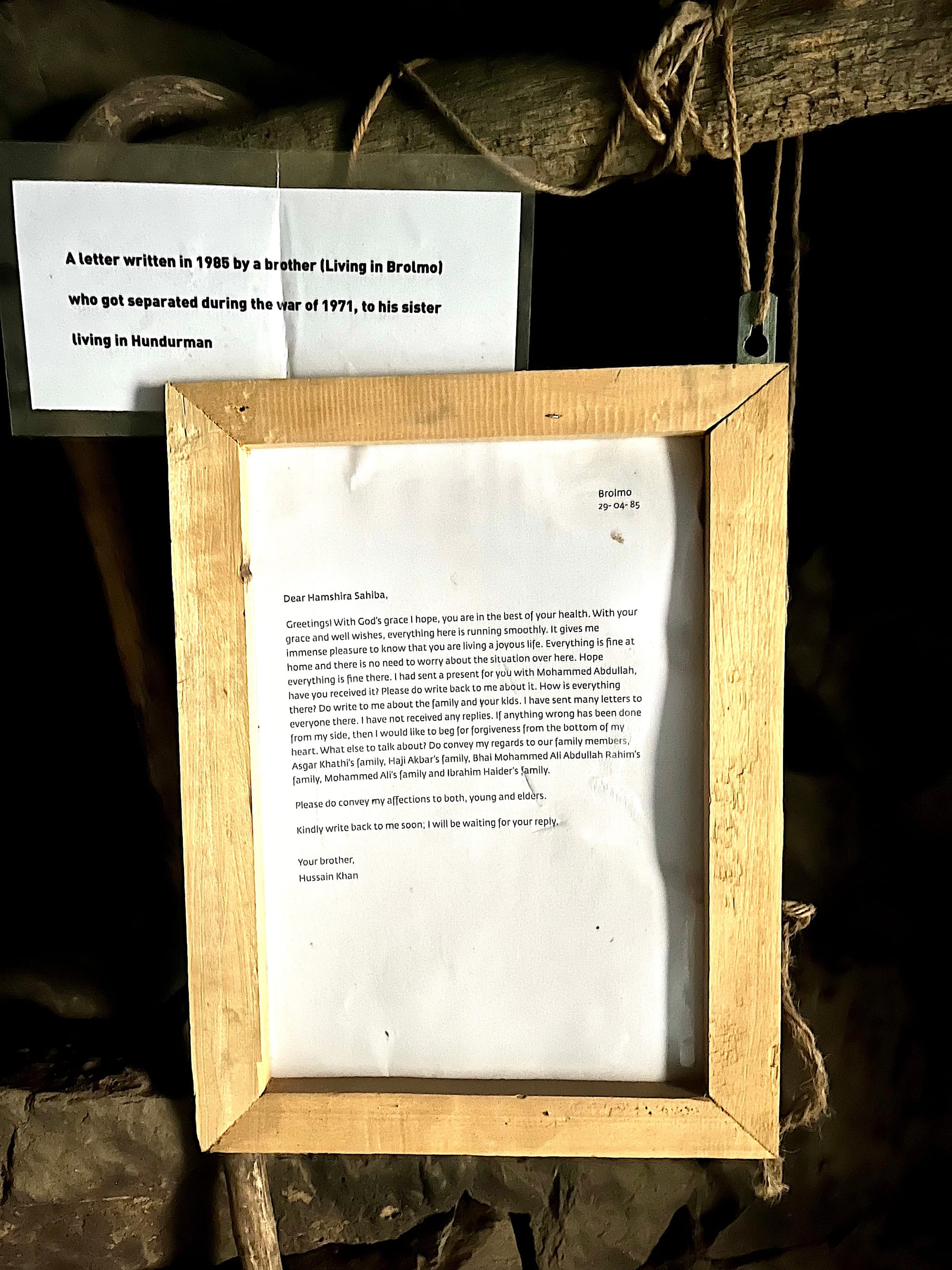 The heart of the museum, however, is not the remnants of war; it’s the human stories. Baqir leads me into a second small room lit by a single window. Here, under protective plastic, are letters, photographs, and personal notebooks donated by the town’s residents. “These are our treasures,” he says softly. Next to the notebook sits a black and white photograph of two young men posing by the Drass River — one of them settled in Pakistan, Baqir explains, and the other lived in Hunderman until he died five years ago. A trove of other intimate objects fill the museum.“There is a pair of worn-out leather shoes a man left by the door, hoping to come back for them; a bridal gown that a newlywed bride abandoned in haste,” Baqir continues. “These objects narrate a story of separation.” One framed letter in particular, translated into English, draws me in. It was written by Baqir’s maternal uncle. His letter reached his family years later, hand-carried by a traveler after cross-border mail resumed. “He kept writing to us, even when no replies came,” Baqir says. “This letter was his last. Now it’s here for our children to read.”