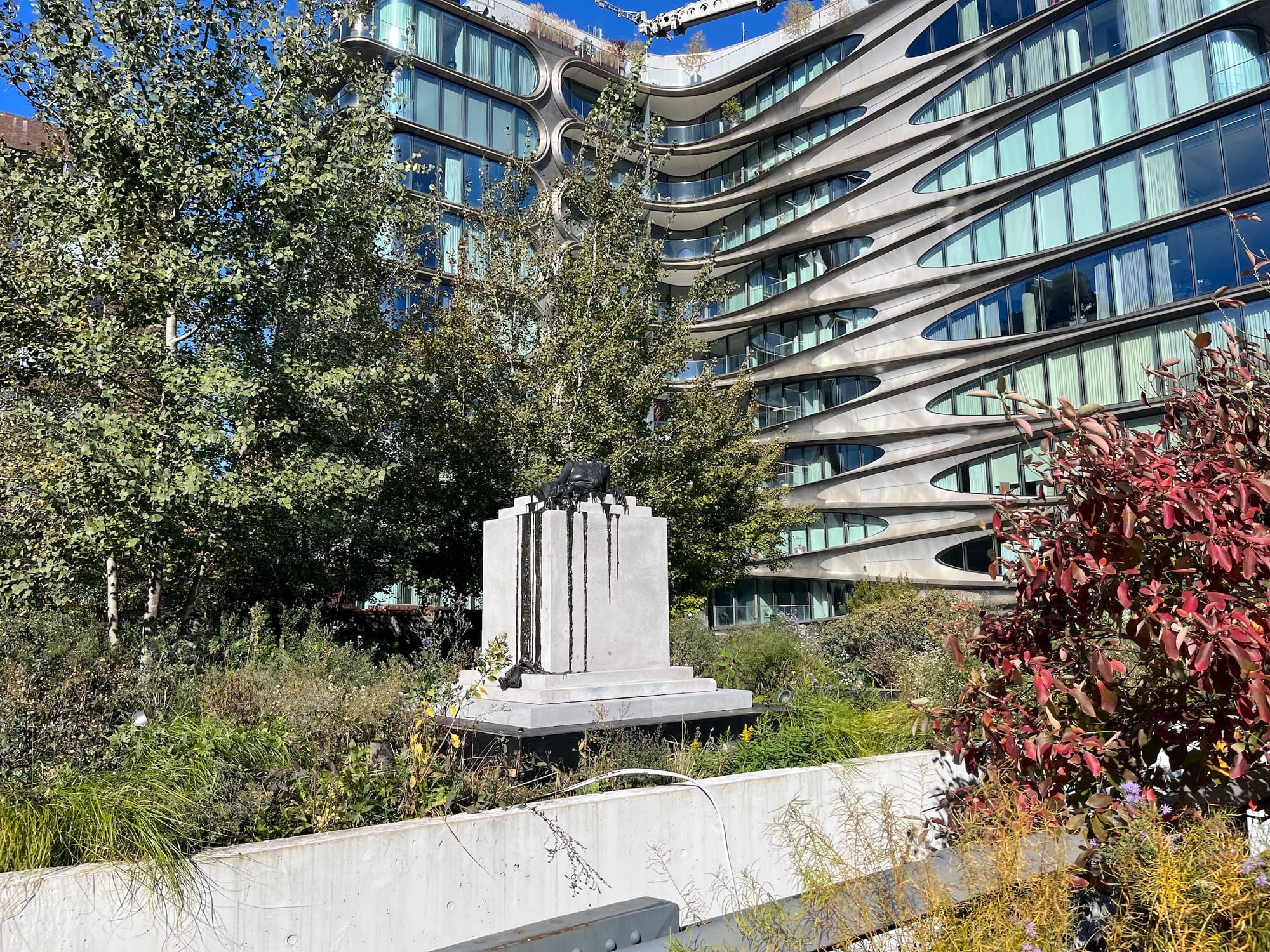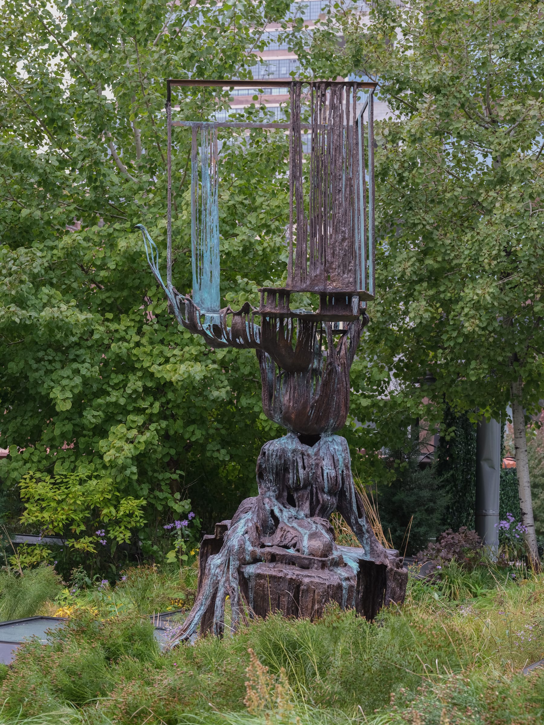 A ladder stretches from a back office space up to the roof, where the honeybees are tucked away at the far corner. The space isn’t quite accessible to the public — it’s perforated with skylights for the exhibition rooms below — but the garden directly faces the High Line. Across a three-foot gap, passersby can see the gallery's current rooftop display: two sculptures by Diana Al-Hadid that link to her show Women, Bronze, and Dangerous Things on view downstairs. "In Mortal Response" (2011) showcases a torso that appears to melt into its pedestal, and "Double Standard" (2022) features another women's form, this one appearing almost aquatic as it reaches toward the ground in tentacle-like forms.