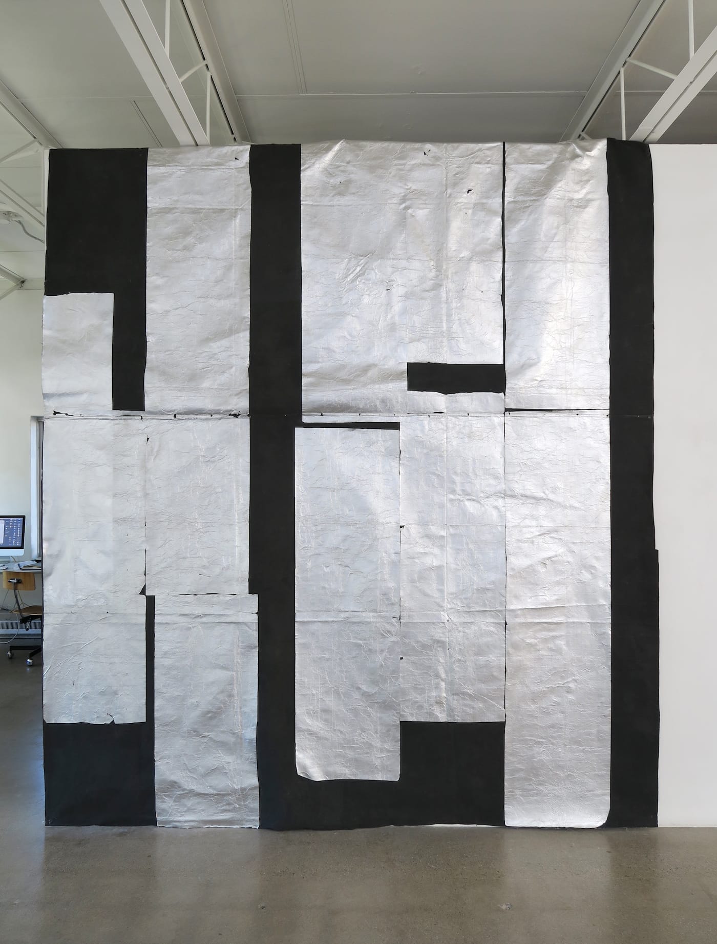 An architectural black canvas sheet layered with wide rectangular strips of aluminum foil spans the height of a front gallery wall. The materiality of this piece –– its presence –– is inextricable from the symbolic presence of the canvas and foil, glimpsed throughout the show, and the presence of the viewer, as the black and silver oscillate between absorption and reflection.