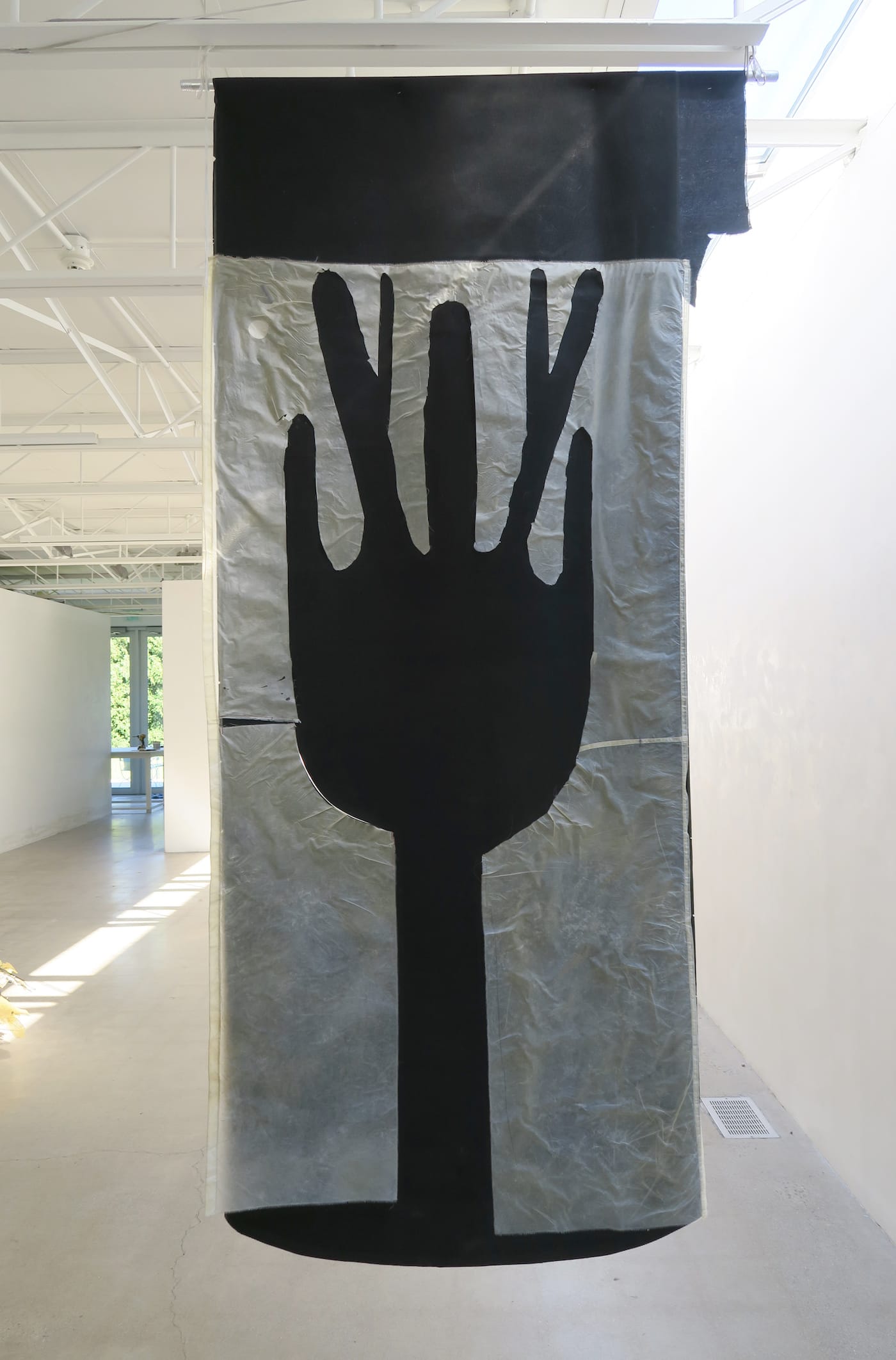 The hands in the title are reified in hand-like shapes recurring throughout the exhibition. (They were also in Levant’s show at Monique Meloche in Chicago.) Near the gallery entrance, a cutout black hand greets the viewer from a canvas banner layered with off-white nylon spinnaker. The ambiguity of the shape –– it could be waving to or yielding the viewer –– is repeated in a 75 x 122-inch black canvas sheet on its own wall in the next room. Here, the hand is made of the off-white spinnaker sail superimposed on the canvas; it reaches out horizontally, with multiple prongs, like a fork or broom.
