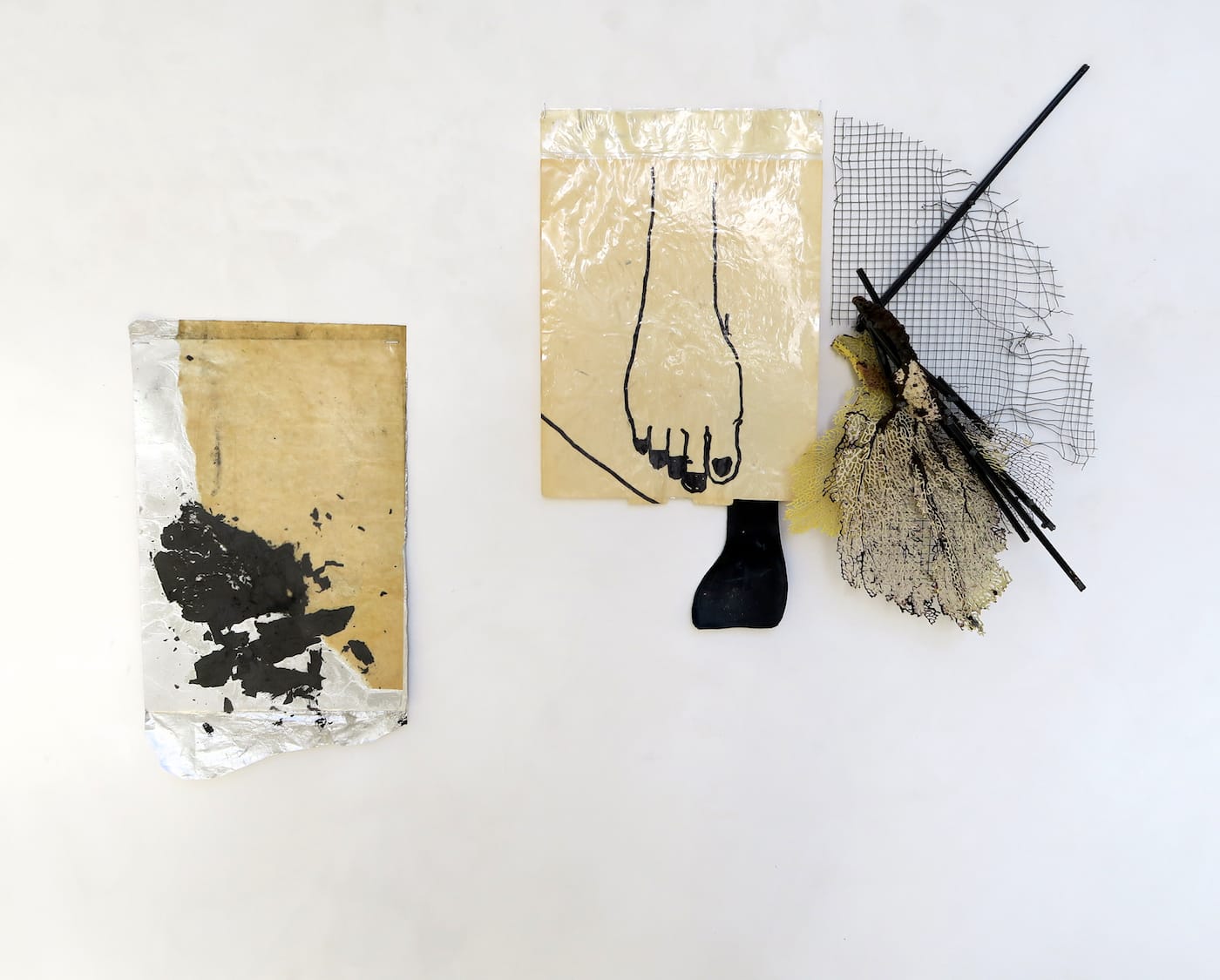 While Levant coaxes out formal affinities in her installations and collages, another commonality shared by her materials, and by extension her artworks, is their relationship with the human body. Although bodies are always implicit in the invisible systems that Levant maps –– from global trade to humanitarian aid –– this exhibition foregrounds the extent to which systems are embodied through the twin cycles of growth and decay, consumption and waste.