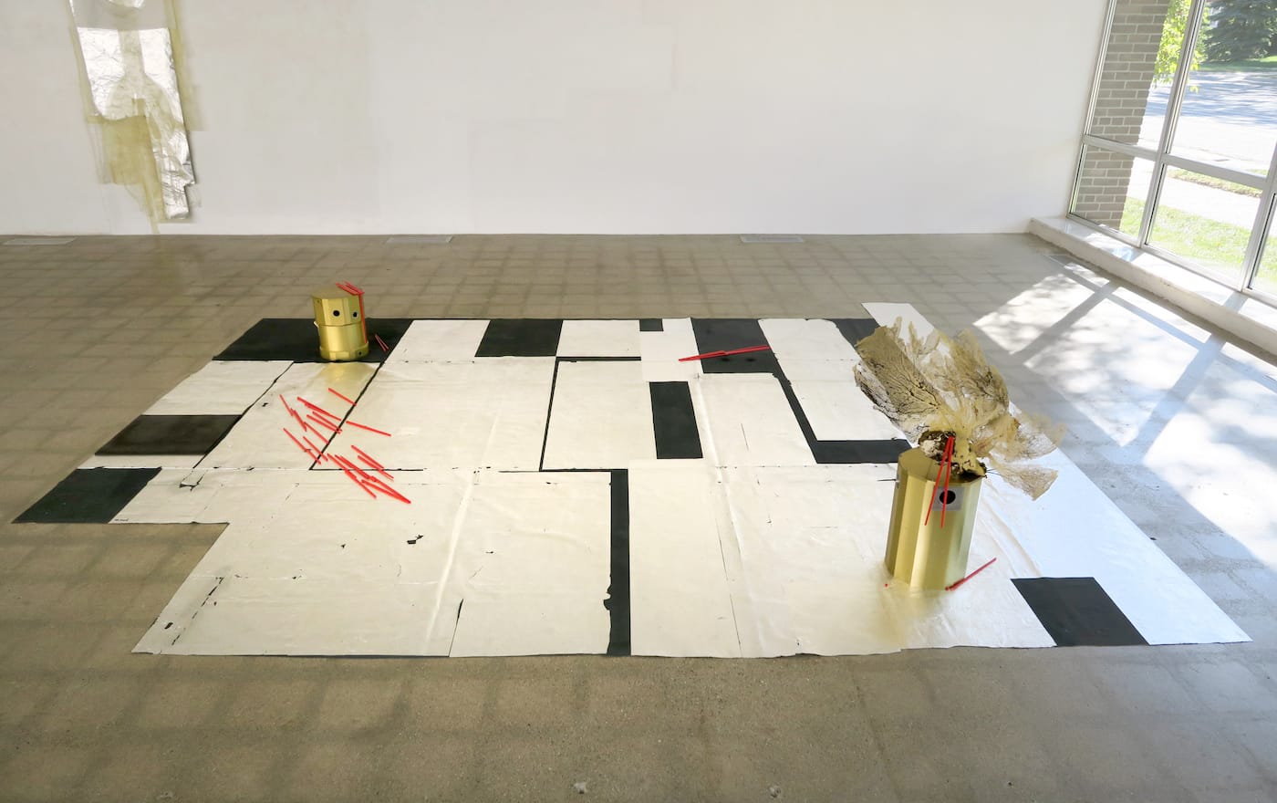 The shows also reflect their respective environments in a very real sense, in that Levant assembles the final pieces in the gallery. Detroit’s Susanne Hilberry Gallery is an expansive space with calm, muted light filtering in from large windows. Simultaneously sparse and immersive, Valerian Dials for Trembling Hands evokes the stillness of an ocean after a shipwreck or storm. As with …Which’s Ploying the Fans, the color palette is mostly neutral — black or indigo-black, silver, off-white, and earth tones are broken up only by occasional bursts of bright red: strips of red canvas and red chopsticks emblazoned on a collage; red chopsticks scattered across a sprawling silver-and-black floor installation; and elsewhere, spilling out of a black plastic bag on the floor, along with seaweed and a package of turmeric. (All works in the show are untitled and dated 2016.)