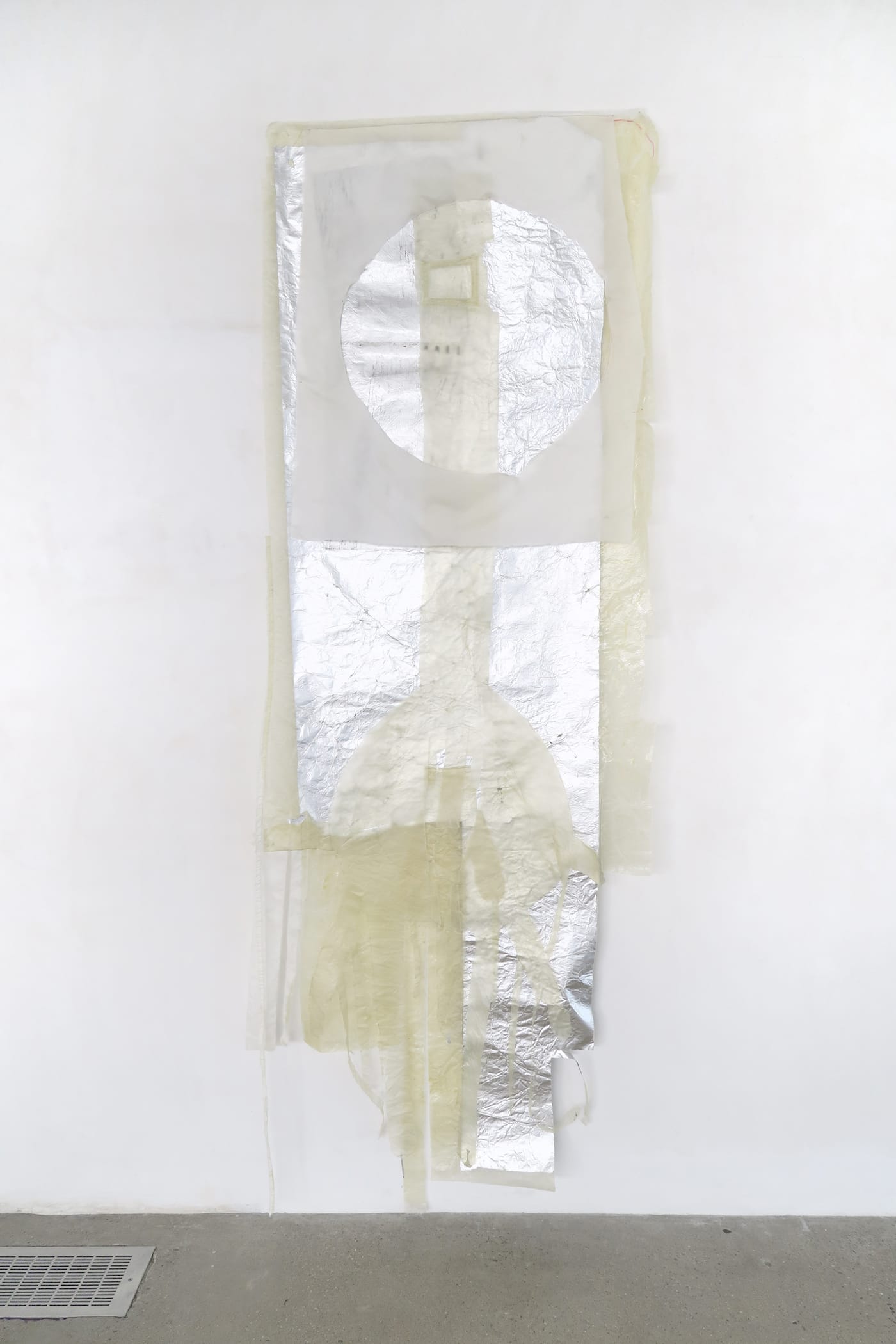 In another piece, a semi-transparent, excessively fingered hand hangs upside down along a 98 x 34-inch length of aluminum foil. The upper half of the foil is layered by a white nylon sheet with a large circle cut out of the center to reveal the foil beneath. The diaphanous materials softly gleam with the quality of fine textiles, creating a sense of movement and tactility that reflects the “trembling” in the title.