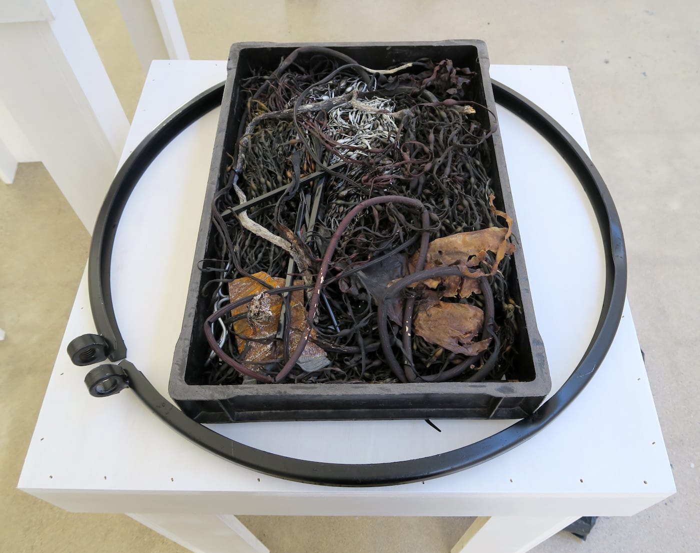At the same time, these intersecting lines diminish the distance between geographic and sociopolitical spheres, and illuminate the layers of meaning that have accrued over the last century upon, for example, seaweed or motor oil. In one installation, seaweed, kelp, and chopsticks are heaped in a rectangular plastic tray encircled by length of steel wire. The gradation of color, from black to indigo to rust and golden-brown, visually coheres the work, while the geometric simplicity of the rectangle and circle are complemented by the almost baroque interlacing of the gossamer seaweed strands. Levant creates the same effect with two more small installations, one juxtaposing a bin of seaweed, kelp, and bits of discarded metal with a “fan” of interwoven seaweed strands and chopsticks, and the other pairing two chopstick fans with Petri dishes and other disparate objects, including electrical tape, ear buds, and Band-Aids. All the objects are integrated to the extent that the whole supersedes the found-object parts.