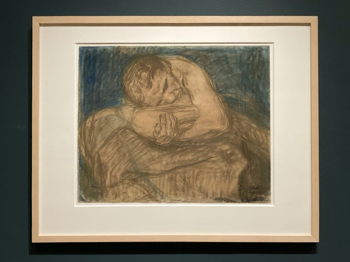 One of Kollwitz’s recurring subjects was the most brutal image of grief: mothers weeping over their dead children. These images are not majestic pietas, yet they are just as raw and agonizing. She often used herself as a model, and looking at the preparatory sketches it’s easy to feel the anguish of drawing her own sleeping child, Peter, as a corpse. Kollwitz’s work is most remarkable and beautiful for its unflinching empathy, and the depth of emotion and pain that she puts before her audience. A whole wall is devoted to the development of the etching “Woman with Dead Child,” through 1903, making it possible to trace her evolution from naturalistic studies to the finished version in which mother and child seem to share one body, and she has almost completely obscured the mother’s face. The resonance of these works has not diminished. How many times have we seen a scene like this represented in the arts?