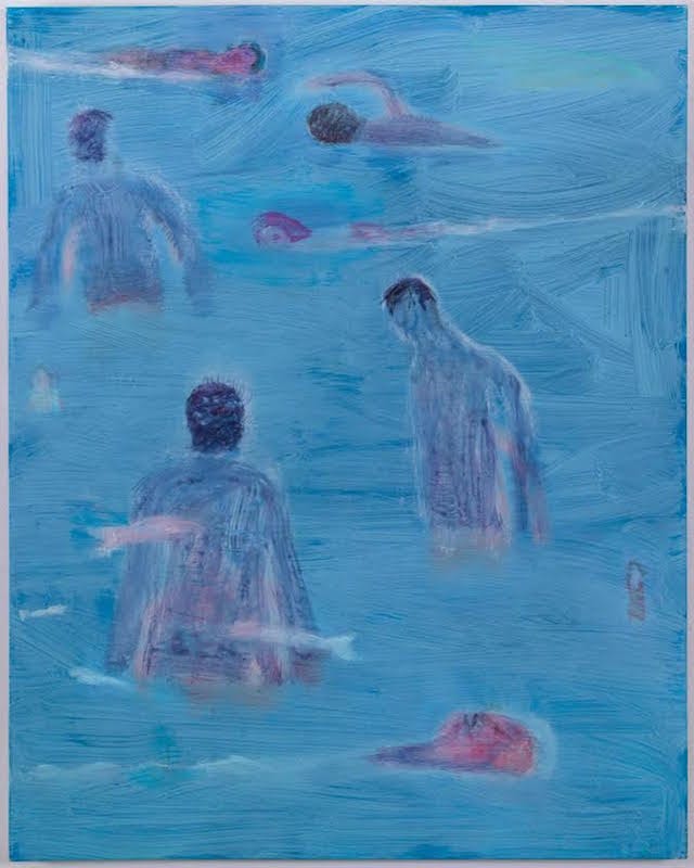 The strongest paintings in the exhibition include “Surf Party” (2015), “Blue Swimmers” (2015), “Fear of Waves” (2015), “Pool Swimmers, Green” (2015) and “Fathers” (2016). One or two colors dominate each of these paintings, which Bradford does not repeat. In “Blue Swimmers” and “Pool Swimmers, Green,” the figures are submerged in a washy field of blue or green, which complicates the figure/ground relationship. This is especially effective in “Blue Swimmers,” one of my favorite paintings in the exhibition, where it is impossible to determine the extent to which the water is submerging the slightly darker, blue-skinned figures, some of whom are standing, while others are swimming. In the painting’s lower left corner, a standing blue figure has been painted over a smaller, pink, swimming figure, an instance of what Philip Guston called “a legible record of all decisions, whether tentative or assured.” In these moments Bradford arrives at what he went on to define as “the simultaneity of thinking and making.” You get the feeling she changed the painting from a benign view to a disconcerting one, and that the transformation was inevitable.