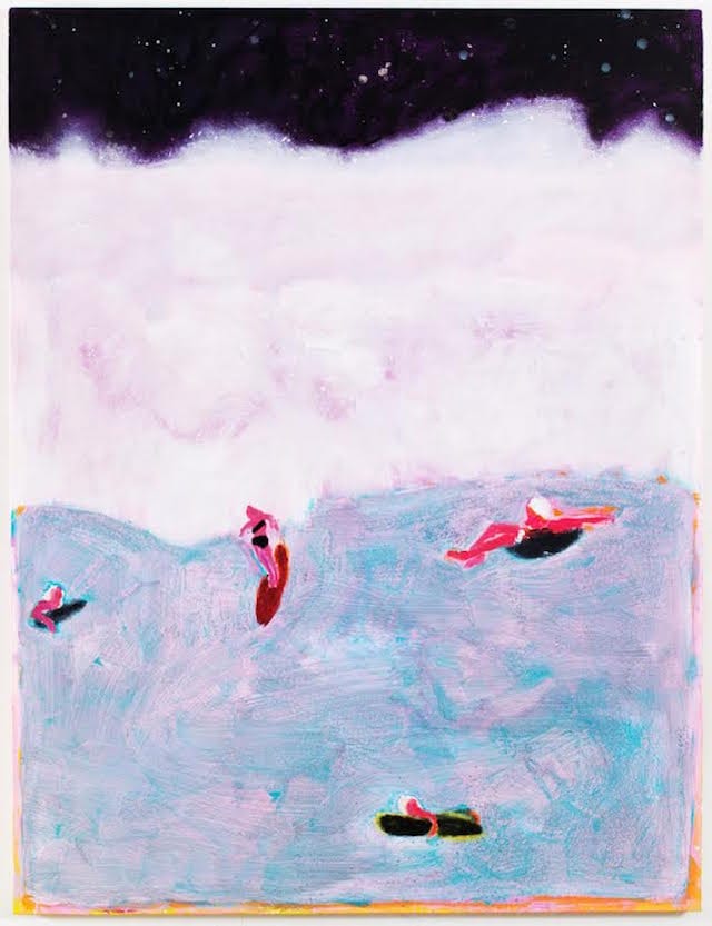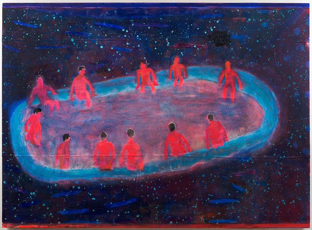 Look long enough at Bradford paintings and all kinds of incongruous details will rise to the surface of your consciousness. What about the figure on the left side of “Surf Party” who appears to be wearing a white astronaut suit? What is the pinkish-red striated wall behind him made of? Doesn’t it look like a slice of flesh taken from some unidentifiable animal? Why has the water in “Blonds in the Sun, Lifeguard” (2015) risen so high that it has covered much of the lifeguard chair, nearly reaching the figure seated in it? Is she a witness to something she cannot stop? Is it a coincidence that the three figures have the same blond hair and blond bathing suits or is it a sign of their collective fear of making waves? What about the naked men in “Fathers” (2016)? They are seated around the edge of a large, rubber wading pool that seems to be floating on an ocean in which the stars are reflected. Are the electric blue streaks we see fish or something else? Questions follow questions, pulling us deeper into these paintings.