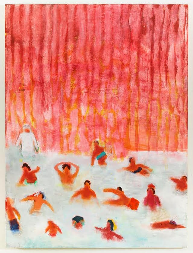 The figures in “Blue Swimmers” are ghostly and insubstantial, made of watery brushstrokes the same consistency as the water. The bluish skin gives the swimmers a deathly pallor, while the crepuscular light is just plain creepy and weird. Who are these hulking figures? Are they zombies on vacation? Bradford does not stop there. What really turns this painting into something else is her placement of what appear to be two fish overlapping the standing figure on the lower left. Are they leaping out of the ocean? Is everyone underwater, including the ones who seem to be swimming? Our inability to locate these things riddles the painting with a disturbing instability. Finally, we are likely to ask ourselves: are these people enjoying themselves or are they stuck in one of the circles of hell, doomed to swim back and forth for eternity?
