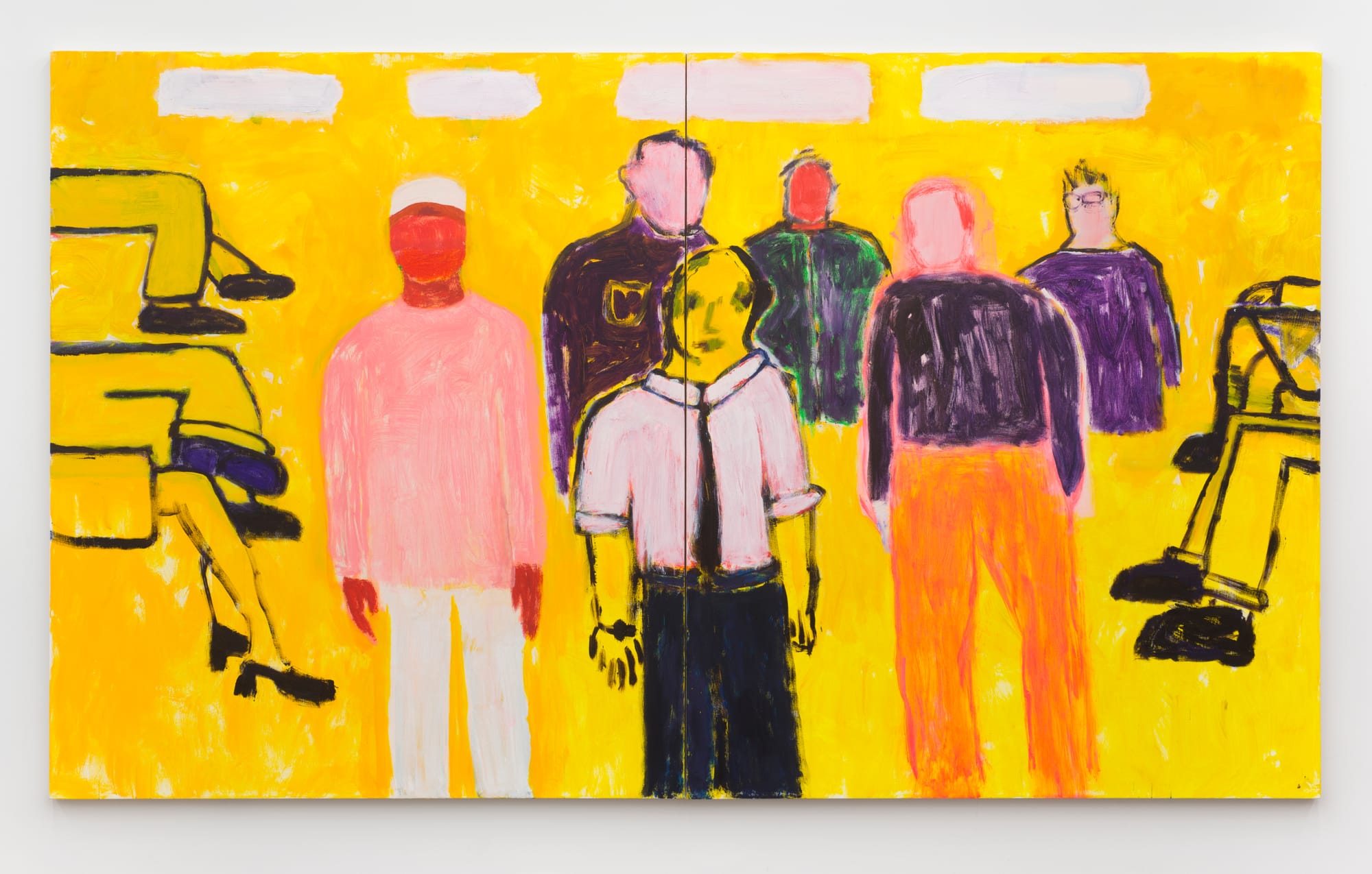 The tension and perhaps irresolvable problems of the individual versus the group comes through in the diptych, “Waiting Room” (2018), where six men are depicted frontally, flanked by the outlines of legs extending in from the painting’s left and right edges. Benign as this painting initially appears, with its egg-yolk yellows, pale pinks, and royal violets, a deep contemporary anxiety fills it in a quiet, understated way.