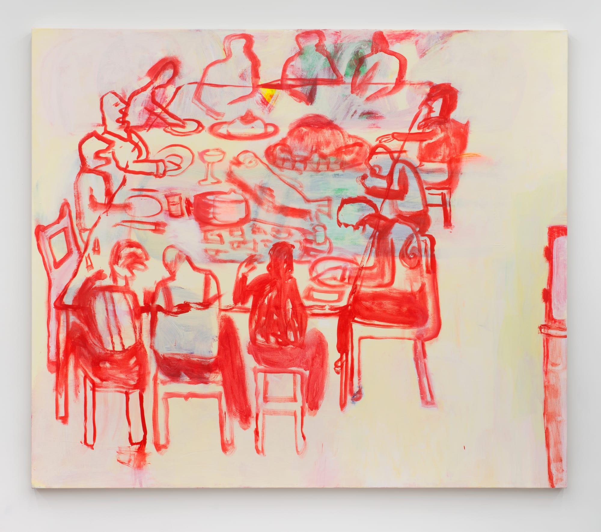 In “Lunch Painting” (2018), 12 figures, outlined in red paint, are gathered around a large table full of food, most notably a large red fish that seems to be smiling. The drawing is rudimentary, with just enough definition to make all the figures and their postures distinctive. Bradford’s abilities with a single, unaltered, calligraphic line are most evident in the three figures at the far end of the tilted table’s outlined plane (which forms a parallelogram), the tops of their heads sitting just below the painting’s top edge. Her animated line tells us about their postures, how their arms rest on the table. She gets a lot out of very little — all while making her drawing seem natural and effortless. The tilt of the table’s plane leads our eye toward the top of the painting.