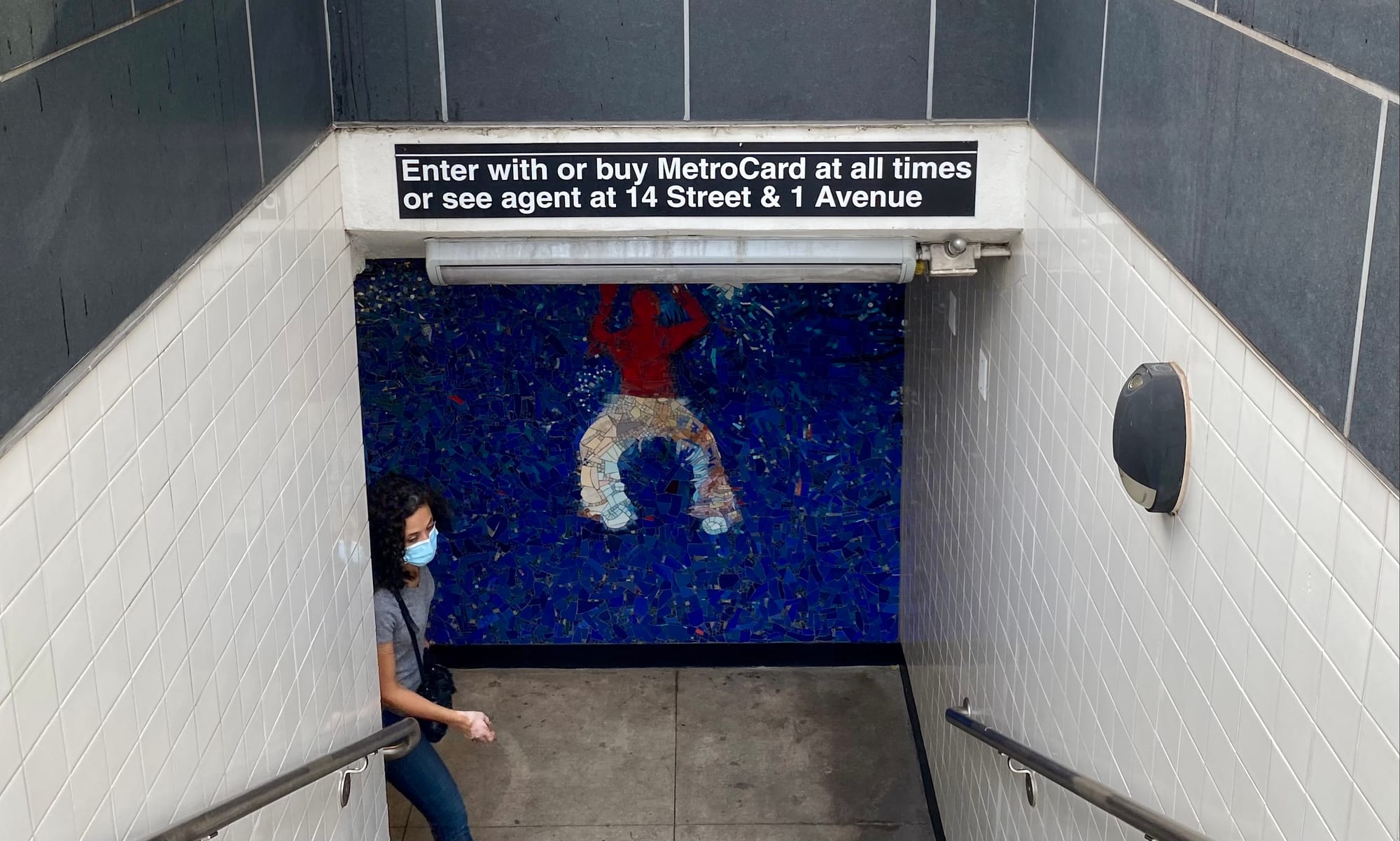 Bradford's permanent installation can be viewed at the L train station at the intersection of First Avenue and East 14th Street in Manhattan.