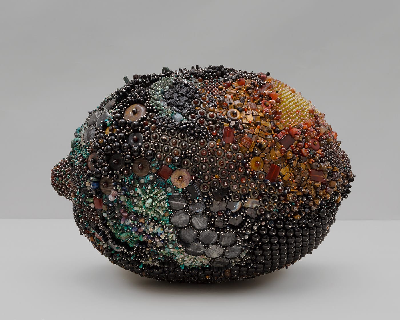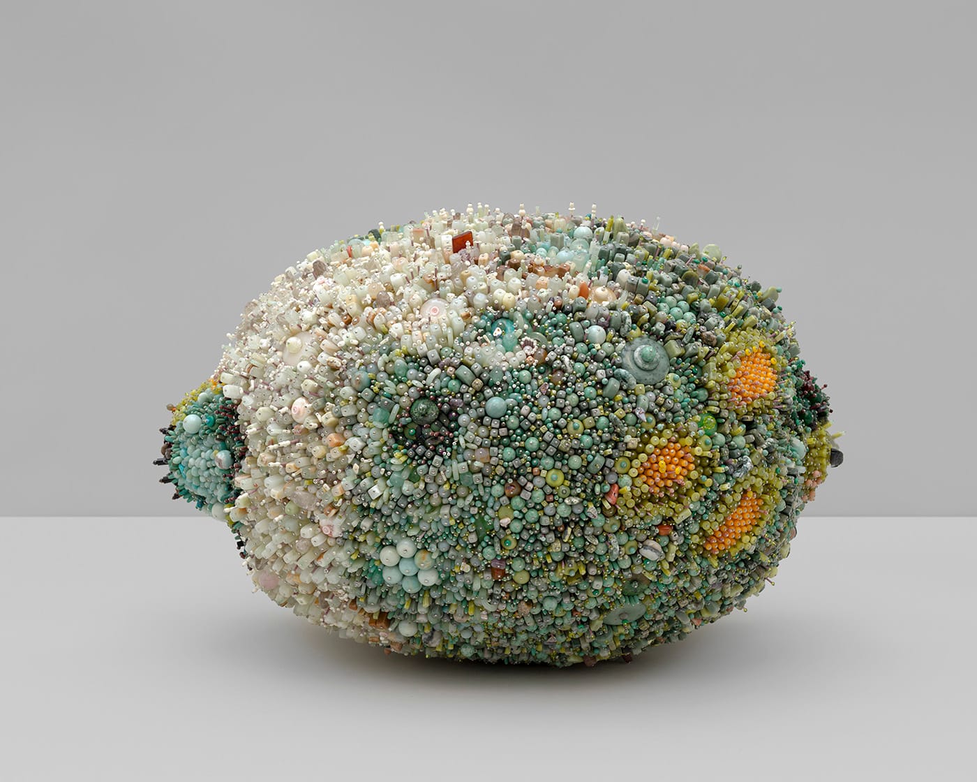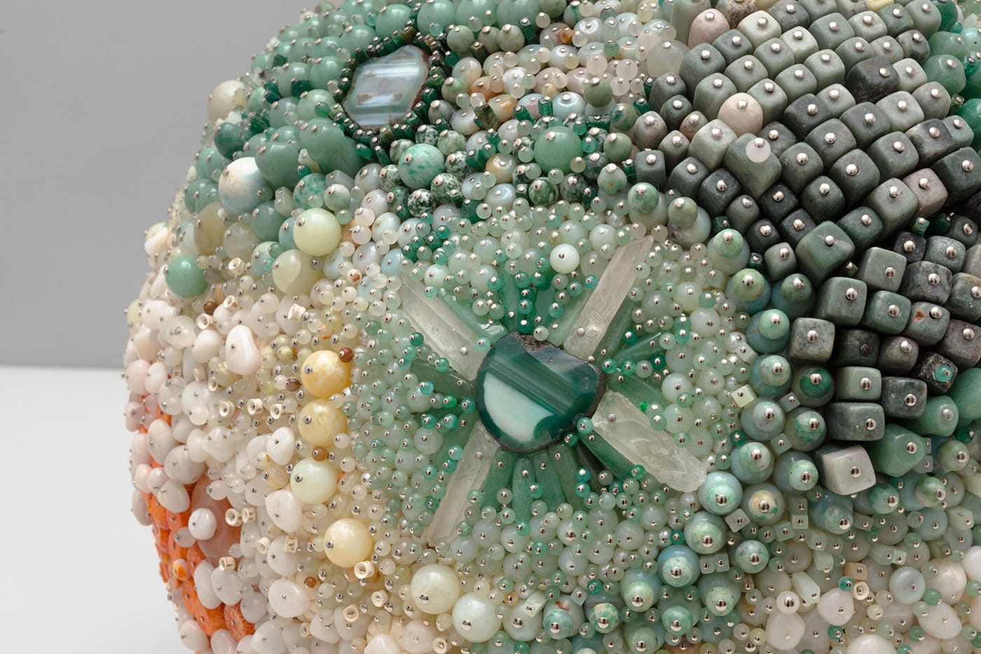 Drawing from real rotting fruit much in the manner of a Dutch still life painter, Ryan translates nature’s handiwork into intricate textural works that strongly balance attraction and repulsion. The gemstones and faceted plastic beads she uses to create the variegated topographies of her produce sculptures are recognizably precious materials. In microcosm they create endlessly fascinating landscapes pinioned on the roughly spherical surfaces of her sculptures by thousands of straight pins. But zooming out from them to a macro view reveals the form as a monument to the inevitable decline of vigor and health. Ryan frames these works as a critique of excess.