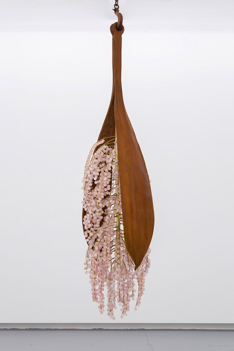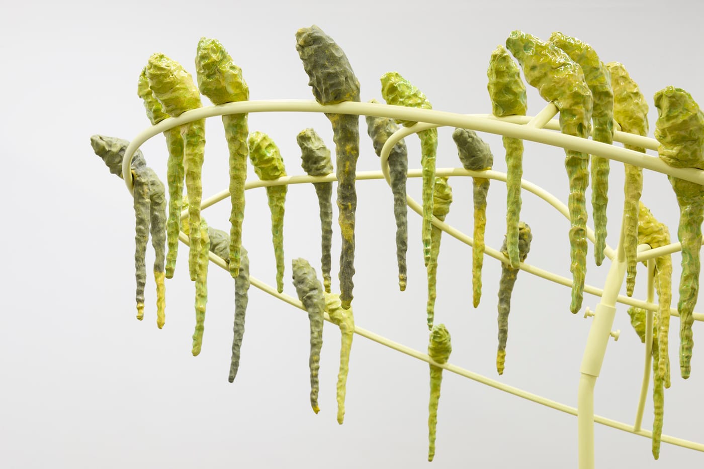 Ryan’s interest in materiality and repetition is evident in other aspects of her oeuvre; she likewise seems to enjoy topping metal armatures with hand-molded ceramic figures that roughly resemble flocks of perching parrots, as with her 2017 work, “Parasol,” or the austere and suggestive “Diana” (2017), that presents a delicately feathered chandelier-like blossom of rose quartz emerging from a giant seed pod rendered in rusted cast iron and hanging from an industrial hook and chain. Though her moldy fruit works are turning heads at the moment, they are clearly not the only part of Ryan’s multifold art practice that manages an arresting balance of opposites.