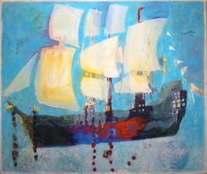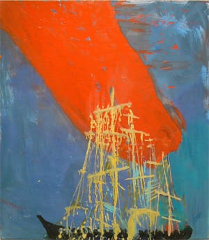 Or one could decide to zoom in on the paintings’ quirky, visionary elements — the three ragged arches rising above the ocean and a white ship (“White Ship of Reason in the Harbor of Chance,” 2011); the red cannonballs falling, like a string of rubies, from a three-masted warship (“Dropping of the Cannon Balls,” 2012); or the large Roman numerals above a becalmed black hull (“S.O.S.,” 2012).