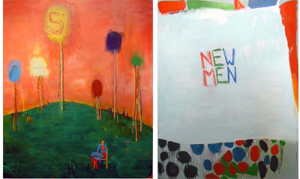 In her current exhibition, Bradford shows mostly large paintings of a strangely lit, monolithic ship and of Superman flying through space, meditations on masculinity. One key to these images is “New Men” (2011), a painting in which she stacked the two title words, with each letter in a different bright color (red, blue, green) on a white field. The use of color to distinguish each letter encourages the viewer to flip the W into an M. Men, the painting optimistically suggests, need to become new, transform themselves.