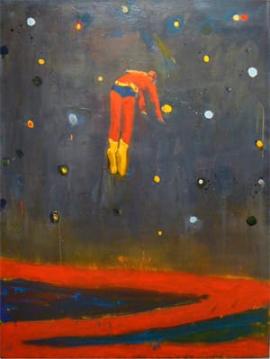 The ships are sharply foreshortened geometric forms, nearly trapezoids, which slyly allude to Minimalist sculpture. They are ungainly and muscle-bound — headless sitting ducks. Meanwhile, her Superman seems to be caught between flying and diving, both a pretender and a wandering line. In these paintings, Bradford views masculinity as simultaneously powerful and impotent, idiotic and funny. Don’t be fooled into thinking that they are not deadly serious, because they are.