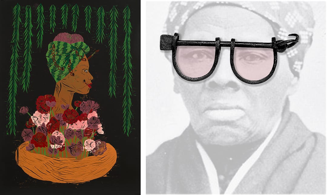 Colin Quashie creates images that comment on contemporary racial stereotypes. In his latest series, called Linked, Quashie combines historical relics and artifacts with icons from past and present popular culture to sharply critique the way people of color are portrayed in modern visual culture. Using his signature caustic wit, he blends images to allow viewers to more fully explore how images of African Americans and Black culture are constructed today. In Gabriel, Quashie tweaks an image of Louie Armstrong, updating his signature trumpet with a set of slave shackles. Similarly, in Rose Colored, he shows Harriet Tubman donning a pair of rose-colored glasses, referencing the abolitionist’s view of slaveholders, for whom she still held a level of empathy.