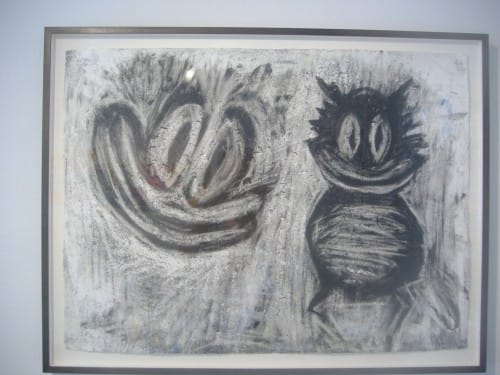 Even though Joyce Pensato‘s works of famous cartoon characters in the exhibition are the least colorful, their size and the strong strokes of the charcoal and pastel make her drawings slightly menacing and give the show a darker and more menacing air.