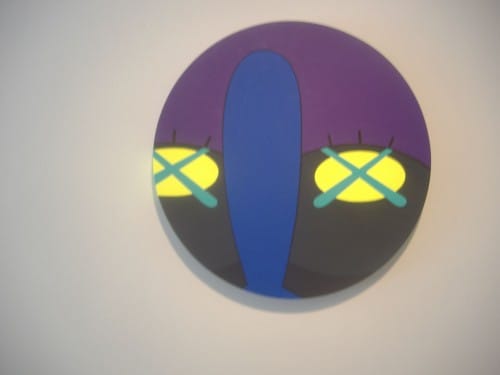 Beginning as a street artist subverting billboards and advertisements with his trademark x-ed out eyes, KAWS’s paintings made a fairly easy transition from the street to canvas. The street art sensibility pervades his gallery work and the bright colors and comic inspiration indicates a connection with graffiti culture, which often looks to the flat graphic world of comics as creative inspiration. While the blatant commercialism of KAWS’s recent stunts such as the Hennessy bottles annoys me, I found myself drawn to his paintings included in the exhibit. Using brilliant colors, particularly the near-blinding yellow for the eyes, his “Double Up” (2011) canvas gives a sense of an animate face even though its structure is distorted.