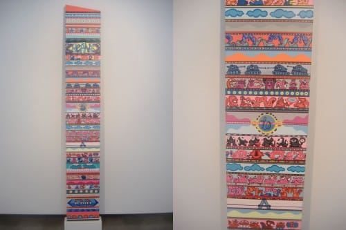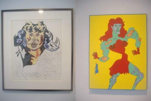 Karl Wirsum, who is associated with the Hairy Who group of artists from Chicago (c. late 1960s) that included Jim Nutt, his work appears as one of the forefathers of the Pop imagery and bright colors of the later generation of artists in the show. Transcending the basic Pop portrait, Wirsum creates movement and grace from his disjointed and meandering lines.