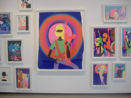 The most political works in the exhibition, Todd James‘s drawings cover an entire wall of the Paul Kasmin Gallery, providing serious cultural statements masked beneath the vibrant cartoonish drawings. At first appearing like crude drawings, the political content with the armed men adds weight to the normally goofy world of cartoons.