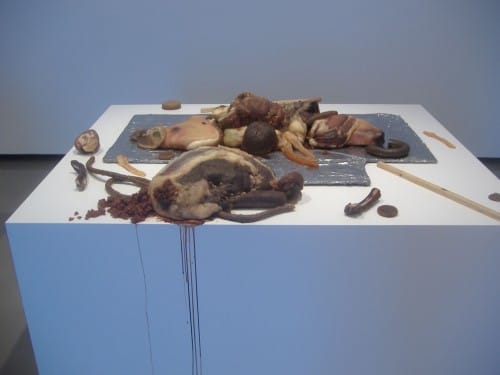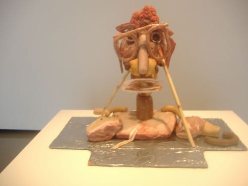 Tony Matelli‘s “Double Meat Head” was the work in the exhibit that seemed to come out of nowhere. After looking at painting and drawings using loud colors to create beautiful works, the bronzes representing a self-portrait out of meat that eventually, in the second sculpture, has disintegrated into a rotting, fly-ridden pile seems out of place in the exhibit. However, the sense of the ordinary materials, whether comic illustrations or meat, and the beauty in their chaotic decay fits in with the theme of the exhibition.
