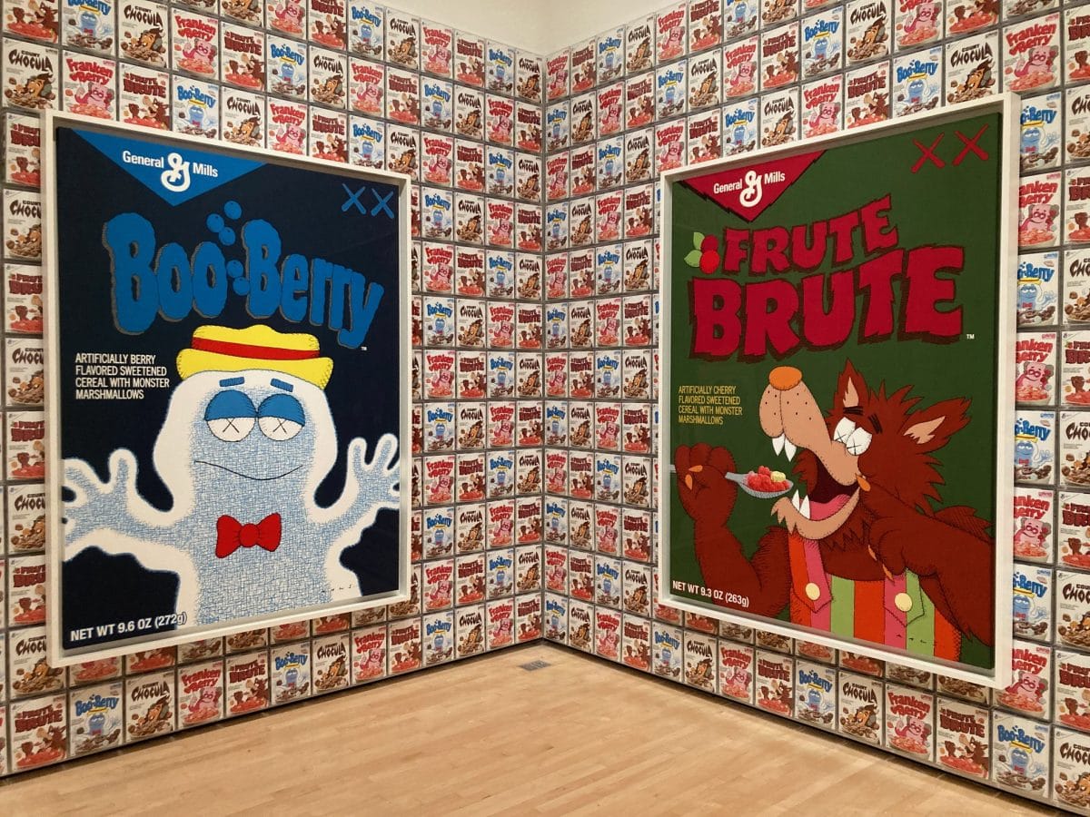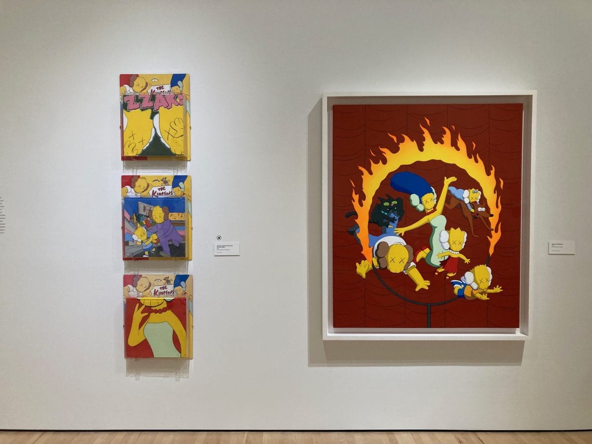 The show never deepens beyond the merchandizing appeal of repackaging familiar forms. Are we supposed to be excited by the juxtaposition of sneakers and paintings, whose joint presentation tells us only that KAWS has beaten the system by having it both ways? Family’s emphasis on these corporate partnerships suggests that something doesn’t need to have the presumed integrity of fine art to be museum worthy as long as it succeeds as an art-adjacent product. And the product itself is all pastiche, an orgy of postmodern signifiers, potentially charming because of our familiarity with these characters, but devoid of any real commentary on pop culture or capitalism.
