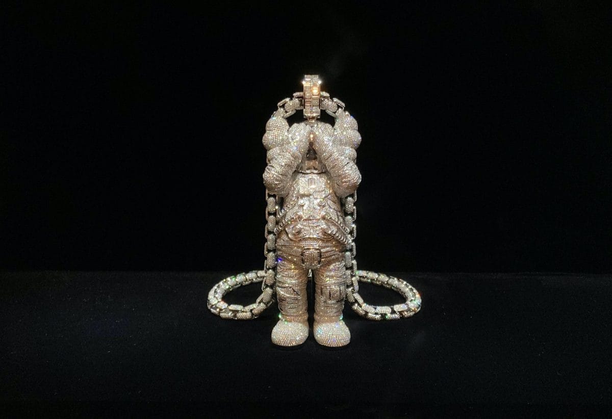 Donnelly himself has admitted that the work he does now has “pretty much nothing to do with graffiti,” citing his engagement with high-end streetwear companies — and he clearly leans into this lineage of commercialism here. In one series that riffs on The Simpsons, titled Kimpsons, the paintings are presented not in frames, but rather plastic blister packs, like action figures for sale at Walmart. Another gallery is lined with cereal boxes that he designed for General Mills in 2022. It’s impossible to see them and not be reminded of Warhol’s Brillo Boxes — but where Warhol was critiquing mass production, Donnelly was actively participating. A white gold and diamond-encrusted necklace commissioned by rapper Kid Cudi bears a striking resemblance to Damien Hirst’s “For the Love of God.” The similarity brought to mind Hirst’s comment, in a 2007 interview with BBC One, that “as an artist you always make work from what’s around you, and money was around me.”
