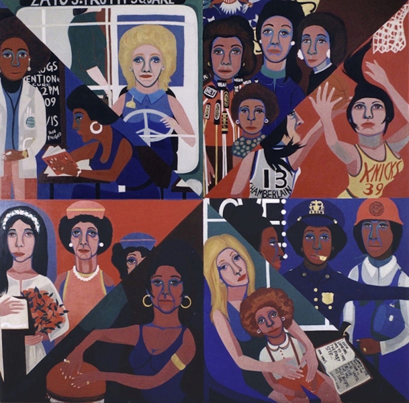 The Brooklyn Museum’s current, corrective survey, We Wanted A Revolution: Black Radical Women 1965-85, opens with an impressive eight-by-eight-feet mural painting. The work is divided into eight, equal triangular sections , each offering a view of women actively at work: suspended narratives like driving a bus or holding a press conference, extended across differences in age, race, and class.