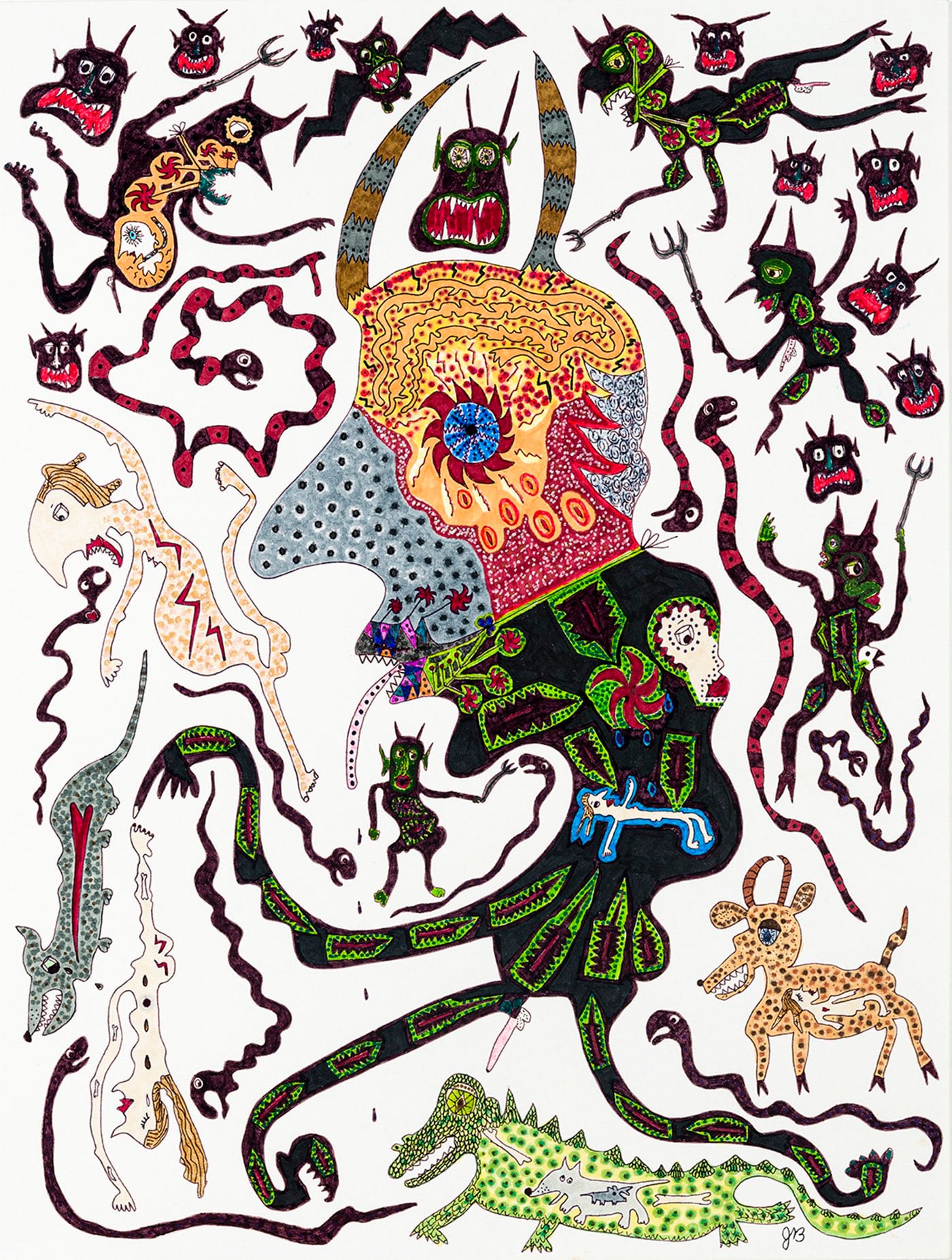 This year’s OAF New York participants offered Hyperallergic an exclusive preview of some of the newest finds they will feature at the fair. Among them, works marked by a certain psychological intensity will be hard to miss, including the ink-on-paper drawings at Hirschl & Adler Modern by Maine-based Jeanne Brousseau (born 1943), a livestock farmer and craftswoman whose stringy human figures and menacing snakes, crabs, alligators, and birds allude to the painful, long-suppressed memories of an adult survivor of childhood sexual abuse. Brousseau began making her drawings when she was in her 40s.