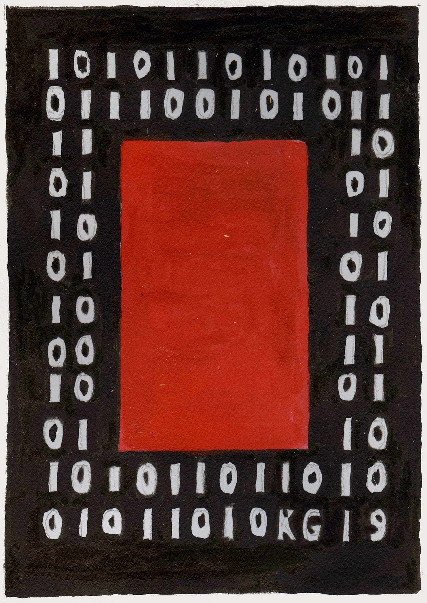 Now employing ink on paper, his newest works boast the primary colors in addition to black and white. In them, the artist also includes the numerals 0 and 1, or, as Grimes points out, “the same binary code that was used to send an interstellar message to the globular star cluster M13 [Messier 13, in the constellation of Hercules] in 1974.” In a recent e-mail interview, he added, “I’ve always felt more connected to aliens in a metaphysical/psychic sense than in a ‘mathematical’ or scientific sense. I think there is an archetypal language that we might share [through] symbols like stars (represented as dots on a star map), satellite dishes, and signals.”