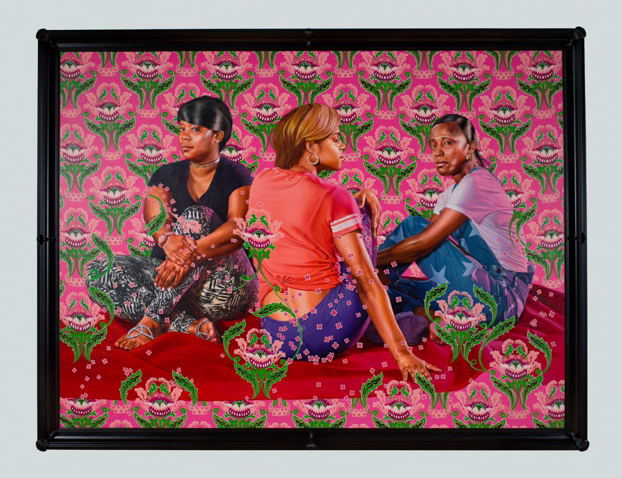 In “Robert Hay Drummond, D. D., Archbishop of York and Chancellor of the Order of the Garter,” a cerulean stem arches over a matching Nike tee on a man in a trim goatee. Then there’s the epic “Three Girls in a Wood,” which stretches laterally 12 feet, its subjects arranged in the likeness of a 1920 Otto Müller painting. In place of nude, mouthless youths rendered in bold Expressionist lines, Wiley presents three women, fully grown and fully attired, floating in a forest of fuchsia on a red swathe of fabric. The swing of their door knocker hoop earrings echo the curve of green filigree swirling around them. On the thumb of the central figure, tattoo ink merges with decorative buds. Though clothed, this triad seems much more human and natural than Müller’s angular underage girls — while no less mysterious for their pensive mien and calculated posture.