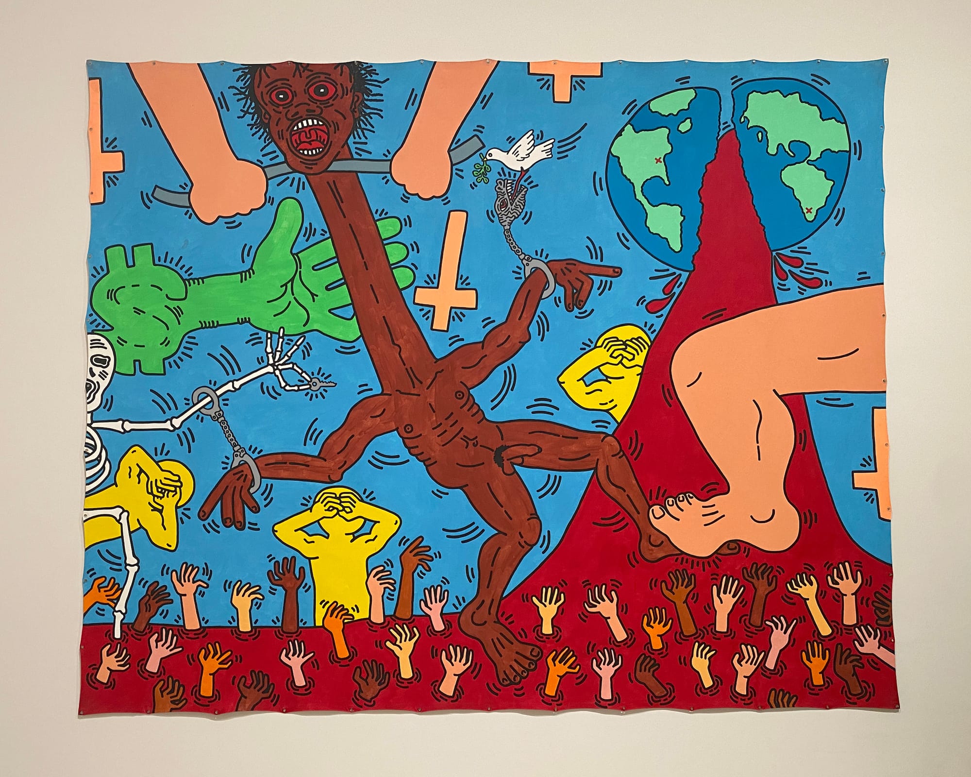 While his facility with iconography shows through, the artist’s work and purpose come to life with social issues. He grapples with his own privilege as a White street artist in “Michael Stewart-USA for Africa,” a grisly painting representing Michael Stewart, a Black artist who was arrested with brutality for making street art and who died two weeks later. In the painting, a Black figure with a long neck is choked by white hands, and a green hand reaches out from a dollar sign, perhaps to choke the figure as well. It stands in contrast to the photos of Haring openly painting subway walls. The work also makes a deliberate connection with South Africa, which at the time was in the midst of a social movement to end apartheid.