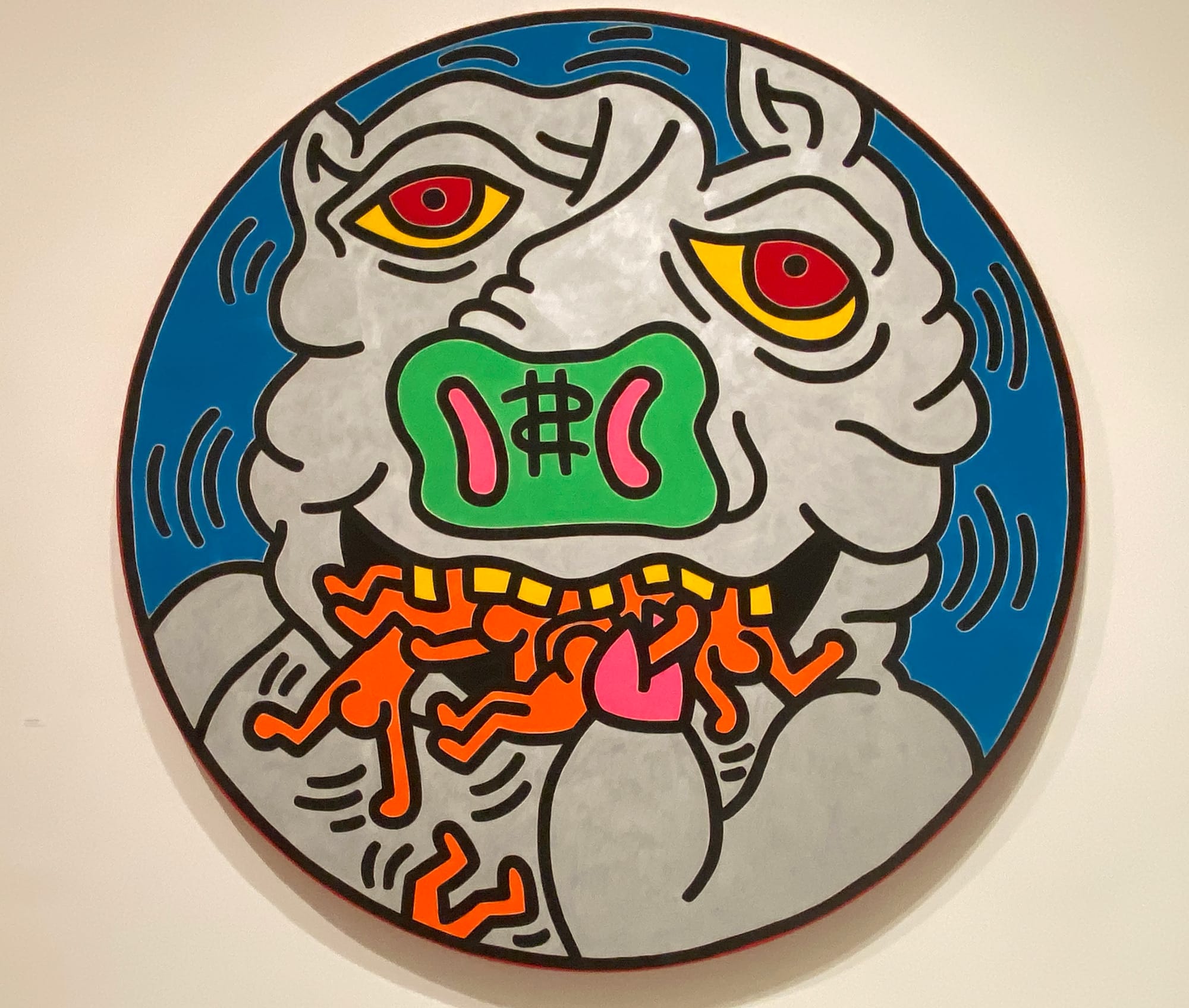 In 1985, Haring opened up the Pop Shop, a commercial space in lower Manhattan where he sold his work. Ephemera from the Keith Haring Foundation displays the range of objects that brought his work to the broader public, like patches, stickers, a skateboard, and a cap. In this same room, a painting shows a huge gray pig with a green nose eating orange human figures. The paradox of Pop Art is its simultaneous embrace and critique of capitalism, and Haring is not unique in that regard. He’s also not wrong that by making his work more accessible in price, he truly made his art something that everybody could own in some fashion.