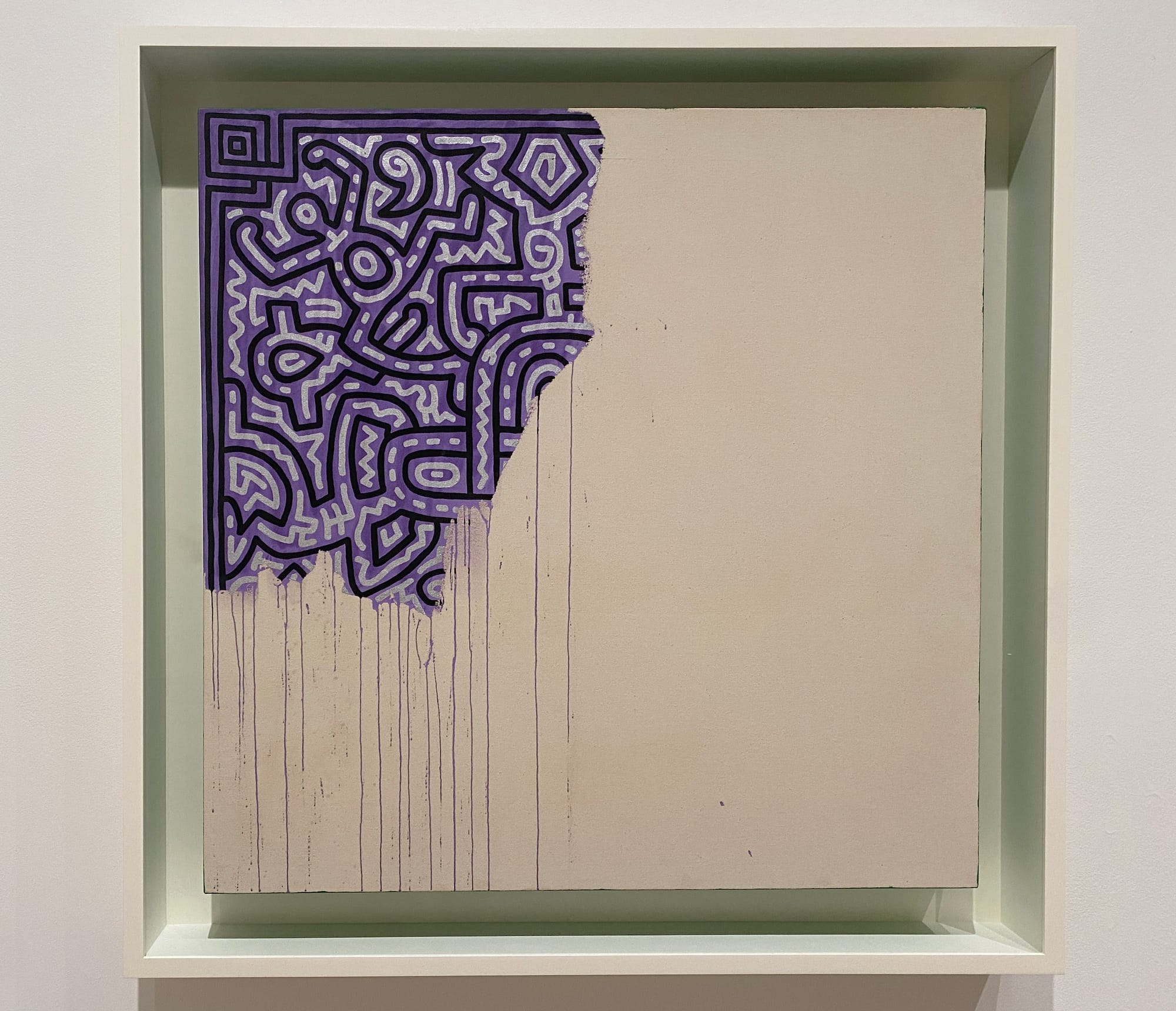 In the final rooms, we return to the artist’s mixtapes, some party photos (Polaroids were the Instagram of their day, and they look exactly like an influencer’s online grid) and his famous work for ACT UP and AIDS awareness. One painting, drained of the artist’s characteristic color, presents a human figure on a black backdrop attacked by a sperm with devil horns. Another painting from 1989 is unfinished, a purple, black, and white world on its way to becoming just a year before his passing. The drips of purple paint are dried on the canvas forever.