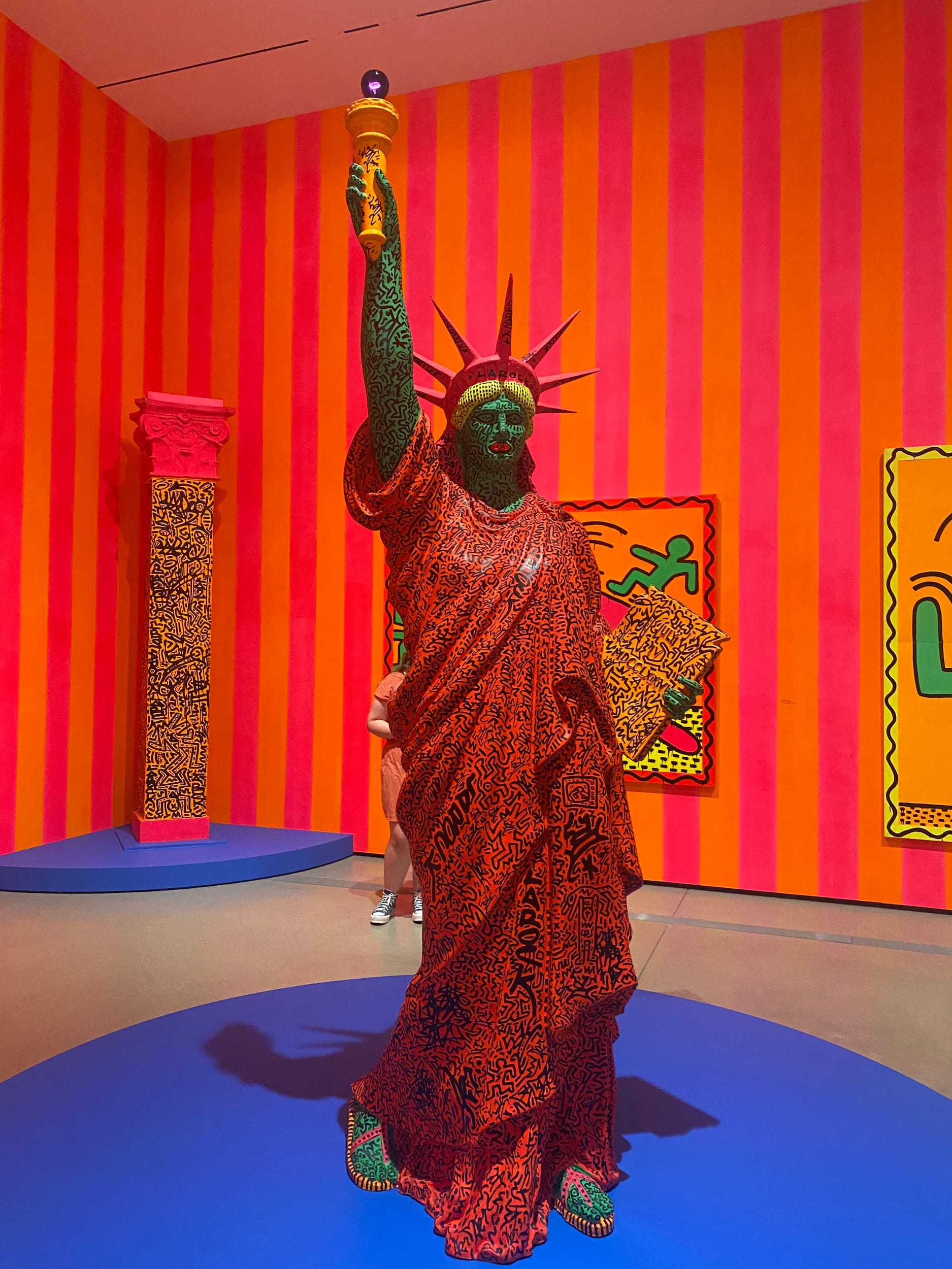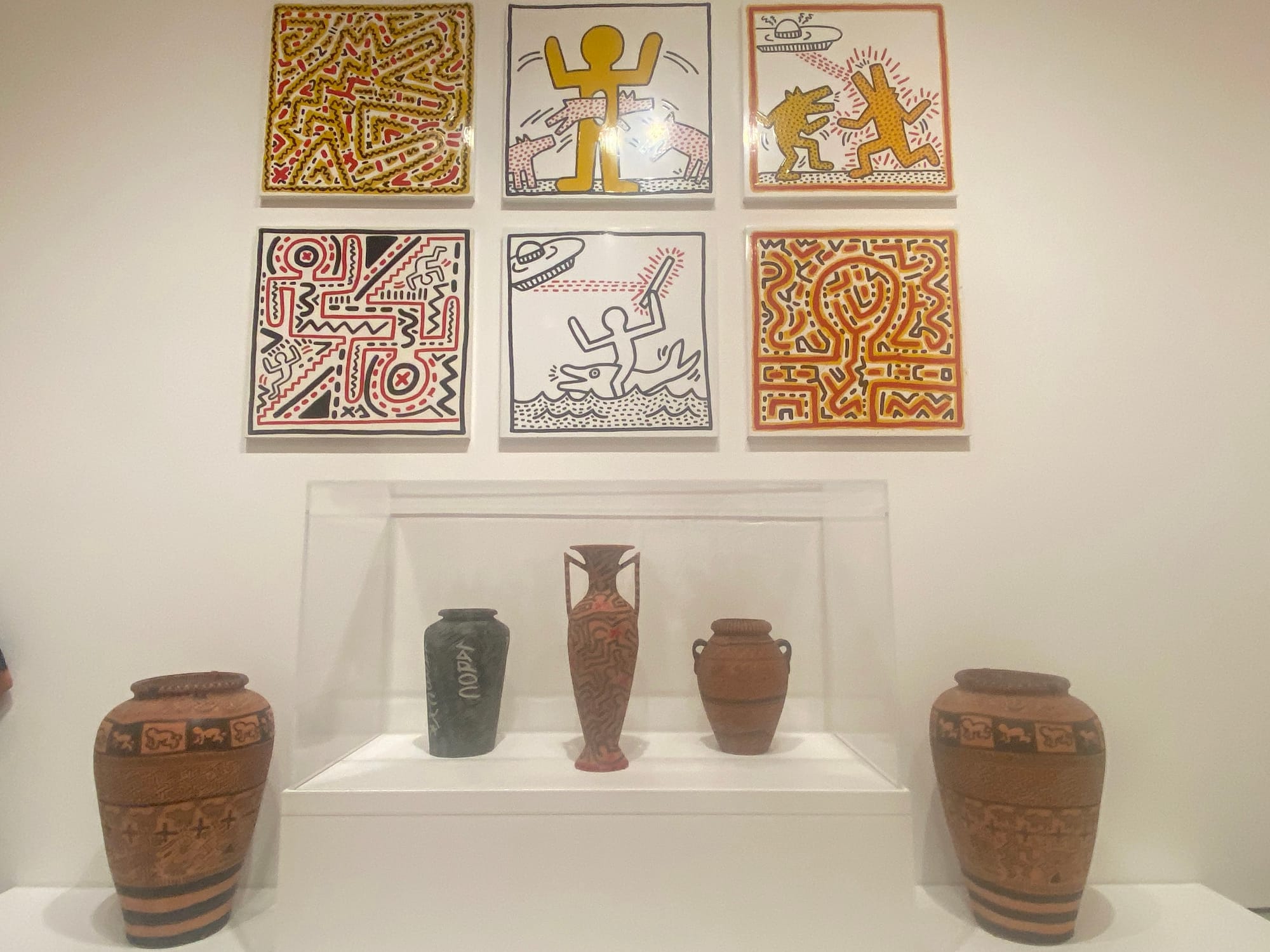 At this point in my experience of the show, the busy crowds faded away and the poppy music drifted off, and I found myself visually tracing the lines and squiggles of Haring’s work, composing a world unto itself. To sit with these expansive artworks is to travel back in time and understand that the world of the 1980s is not so far from today’s. The artist is no longer alive but everything he tackled is very much alive — even, yes, the aliens — in our headlines and our politics.