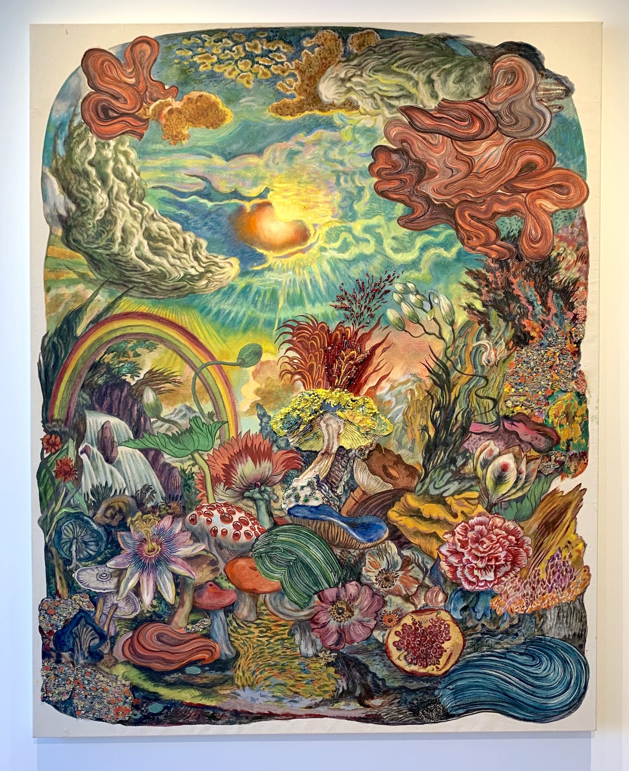 LOS ANGELES — In Sweet Discipline from Koreatown, a new series of vibrant, colorful, thickly textured landscape and portrait paintings on view at Shulamit Nazarian, Korean-born Ken Gun Min introduces an exotic fantasy world that reflects his personal experiences and longings as a gay Asian man living in the diverse melting pot of Los Angeles. In the landscapes, most of which are based on real locations and their histories, he expresses nostalgia for what he calls the “classic gay cruising” of the pre-hookup app days that occurred in places such as MacArthur Park, where more recently trans women have been stabbed by a street gang. Several of the landscapes are populated with narratives in which naked men are at one with nature and each other in a paradise where virtually anything goes. In other examples, humans are represented allegorically by animals who find themselves in perilous situations.