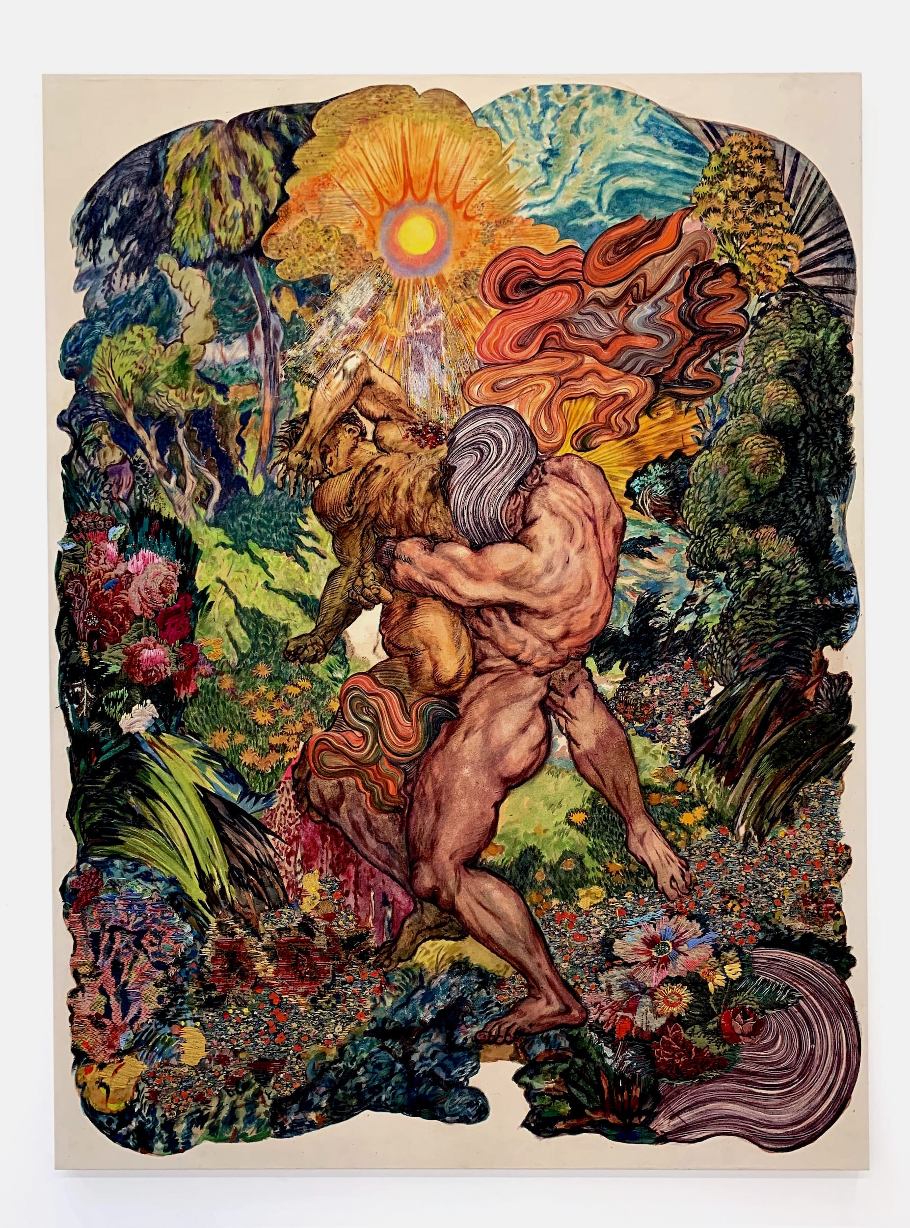 Min’s vision of a gay utopia is exuberantly revealed in “Ambiguous Yoga Club” (2023), where two naked muscular men engage in an erotic encounter in an idealized outdoor setting of lush flowers and bristling trees. The idea that this could be a place for uninhibited sexual freedom is suggested by the pulsating rays of a radiant sun as well as the abstract gestures that swirl throughout the composition as sexual energy, forms that the artist considers to be gateways to states of meditative transcendence. Drawing on Western and Eastern art historical traditions, the figures’ poses derive from both European representations of Hercules wrestling Antaeus and early 20th-century Japanese woodblock prints.