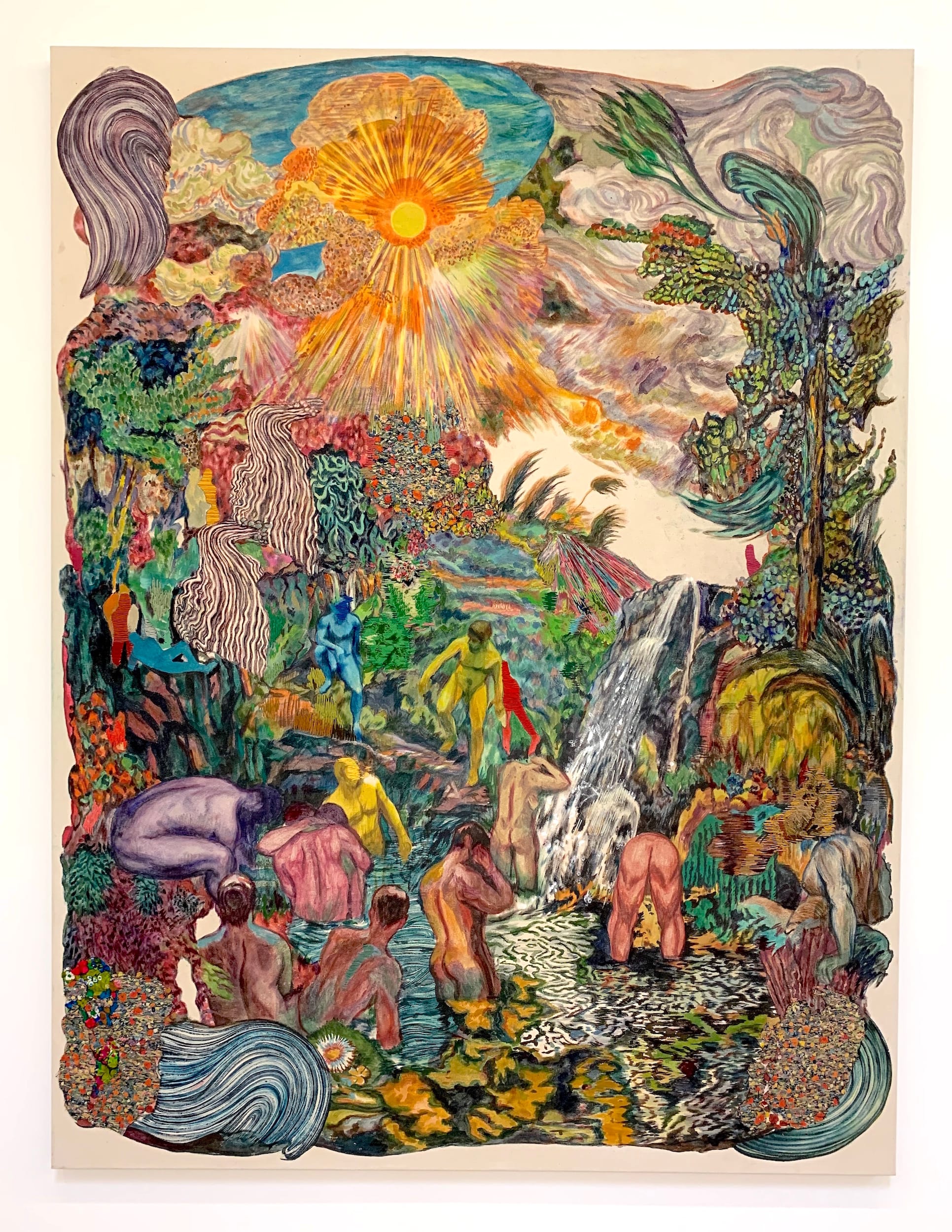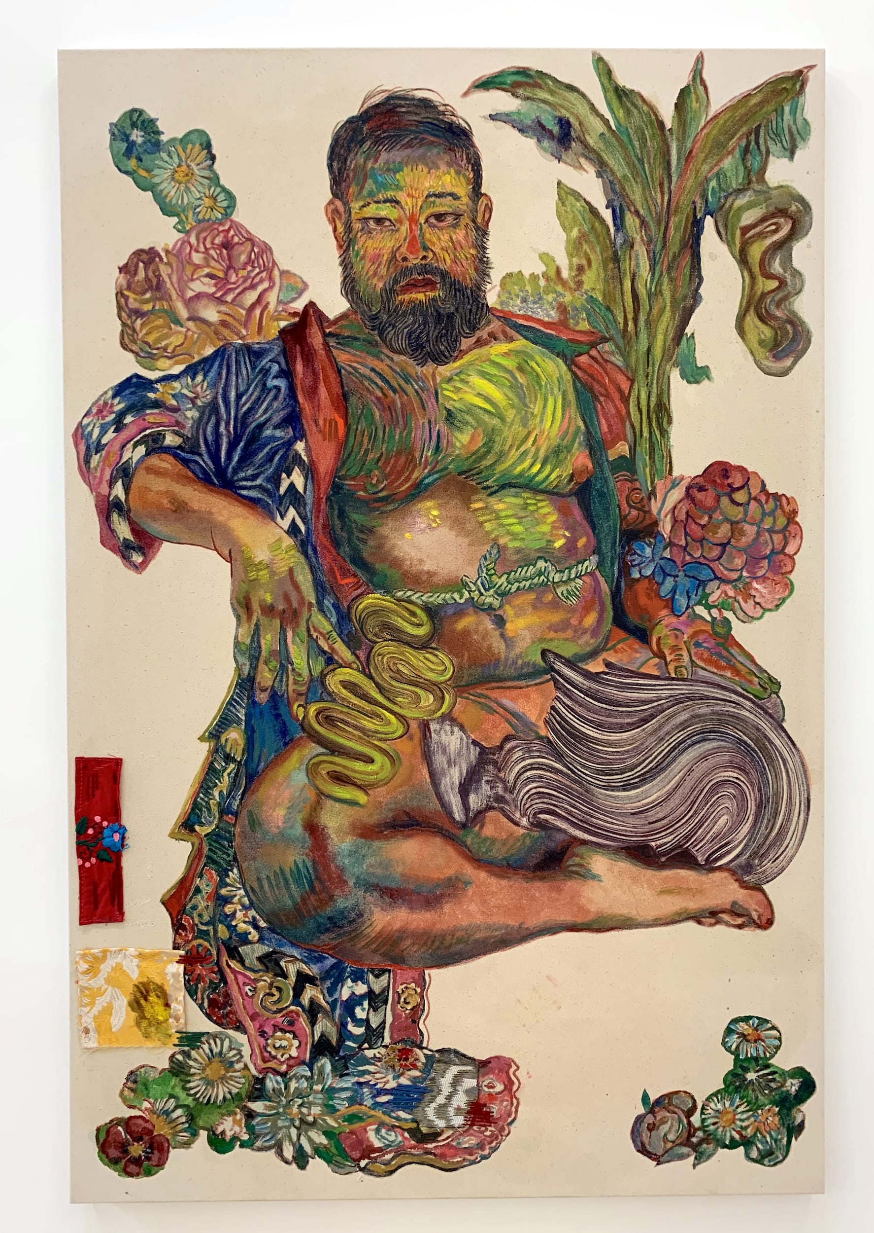 Min’s particular recipe for creating the distinctive textures in his paintings is twofold. First, he pays homage to his Asian heritage by preparing each surface with layers of Japanese bookbinding glue, which creates a rough tooth to capture the Korean pigments that he employs. More importantly, he embroiders sections of painted canvas with threads and beads, thereby joining other queer male artists who repurpose craft techniques that were once considered to be “low art” or exclusively feminine. As an artist drawing on traditions and processes from multiple cultures, and enjoying some of the freedoms brought about by the sexual revolution, Min brings a complex and celebratory perspective to LA's queer history.