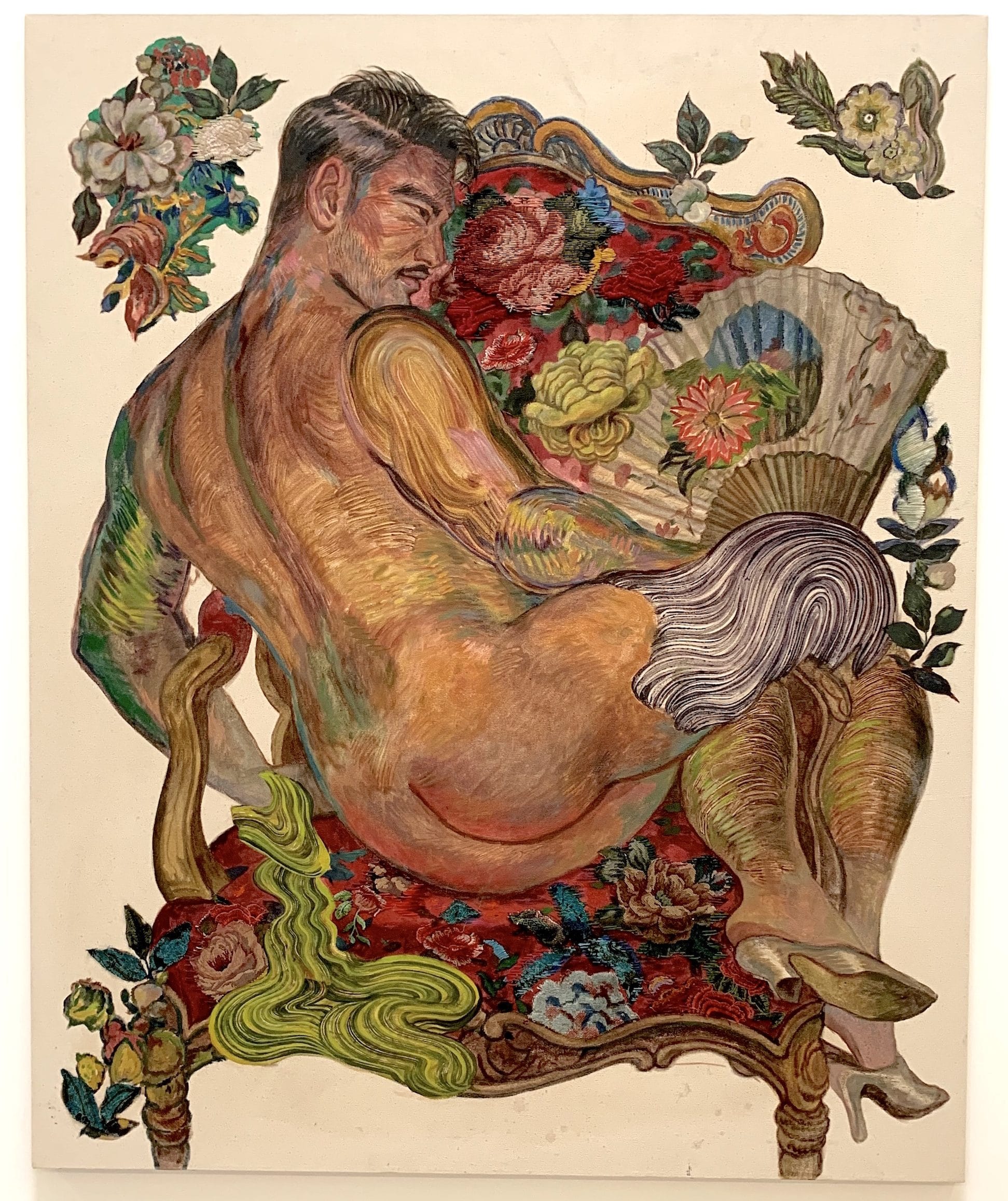 With the portraits, Min depicts a variety of body types and shows Asian men as strong and confident, yet vulnerable. Adhering to the Jungian concept that all people comprise both male and female qualities, “East Hollywood Red Chair” (2023) depicts a muscular man in a sexually suggestive beefcake pose, wearing high heels. Surrounded by plants and flowers, the mature man in “Daddy Lives in Hollywood Hills” (2023) could be mistaken for a Buddha-like figure espousing his wisdom.