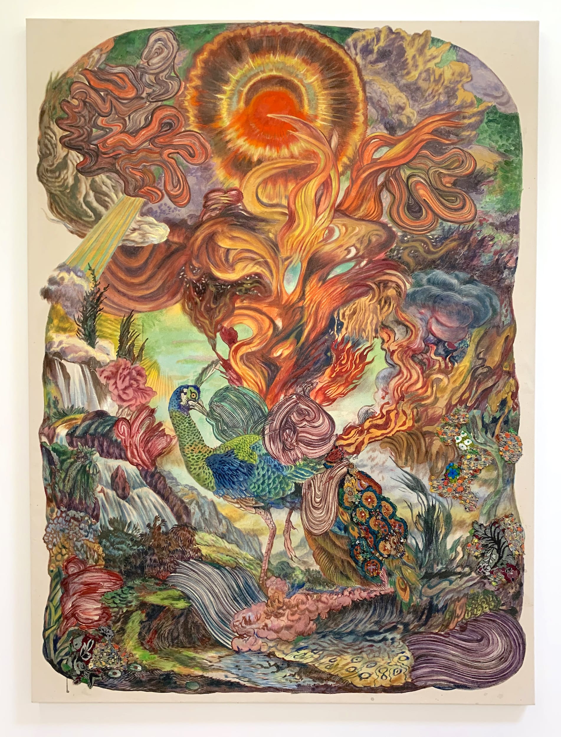 In a related work, “Stranger by the Lake (Bare Ass Creek)” (2023), Min pays tribute to a once-popular nude sunbathing and trysting spot in Angeles National Forest that was ravaged by fire in 2009. Although the scene recalls pastoral, nonsexual representations of communal outdoor bathing by Puvis de Chavannes and Paul Cézanne, the unnatural complexions recall the dissonant palettes in early 20th-century German Expressionism, lending a foreboding tone that points to the health and legal risks of public sexual display. Other dangers associated with the parks are the central focus in “13 Missing Ladies” (2023), where botanical forms symbolize trans women who have disappeared from the Westlake neighborhood near Min’s residence, and “You May Disappear Here” (2023) features a peacock whose back is on fire while being threatened by a cascading waterfall. The artist chose the bird as a metaphor for marginalized individuals.