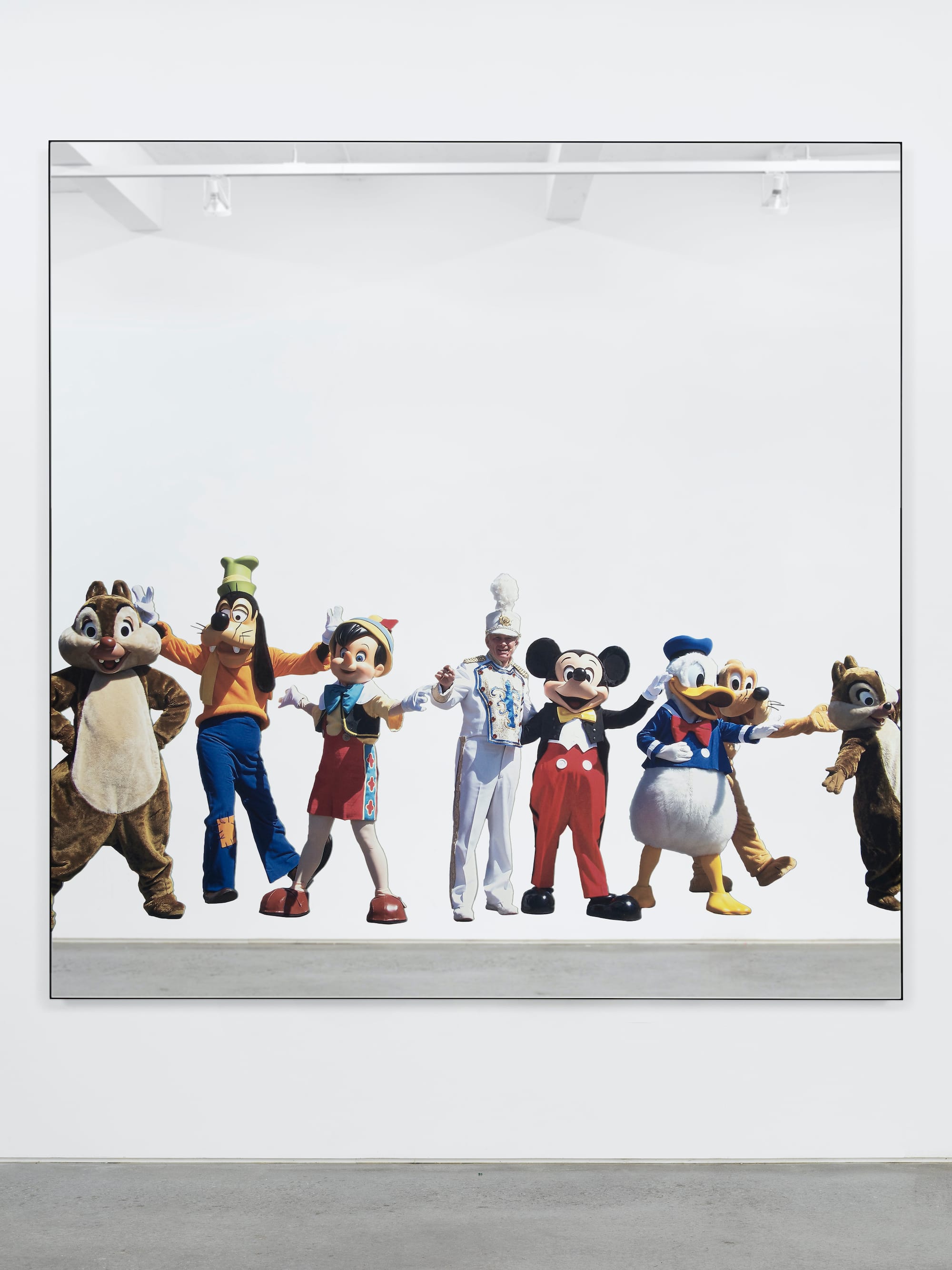 The mirror seems, from some vantage points, like a huge, gray sky filling the top three quarters of the work, but from others reflects the surrounding architecture, other artworks, and — importantly — viewers. On an adjacent wall is the startling and, for me, mesmerizing “Main Street, USA” (2021). Costumed Disney characters — Goofy, Pinocchio, Mickey, Donald — along with a marching band member in a splendid white suit, and others, decontextualized, form an enthusiastic, but unnerving and bereft troupe in a void.