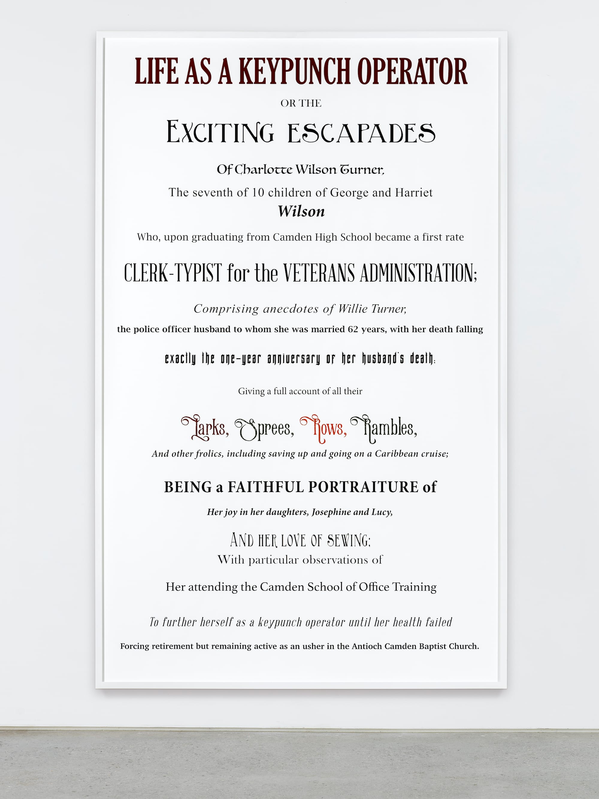 Also here are two fictive yet plausible large obituaries from the Necrology series. In the typographical style and cadences of 18th- and 19th-century frontispieces, they announce the life and death of an otherwise obscure Camden, New Jersey, clerk-typist/keypunch operator and a woman from the Manila slums who was lured into drug smuggling by a “phony employment recruiter” and ultimately executed in Indonesia by firing squad. Lum invests them with historical drama and grandeur.