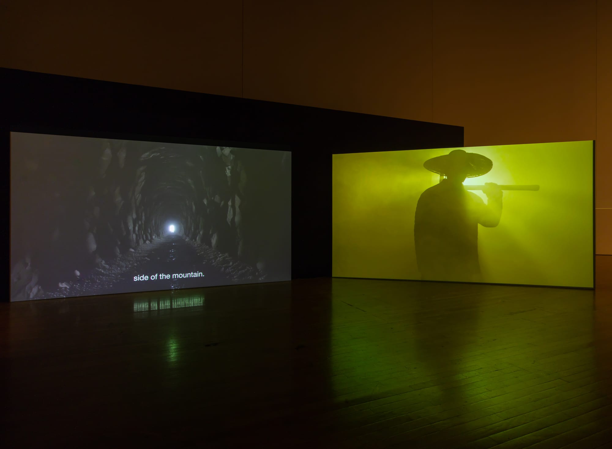 The other half of the two-channel video installation is composed of two lulling dolly shots that travel back and forth through the inside of a rail tunnel; one inches toward the light at the end of the tunnel, while the other recedes from it. Sometimes appearing simultaneously, they evoke an endless tunnel. Fictional voice-over narrates these scenes from the perspective of one of the 20,000+ Chinese immigrants who worked on the transcontinental railroad for significantly lower wages (and in much poorer conditions) than white workers.